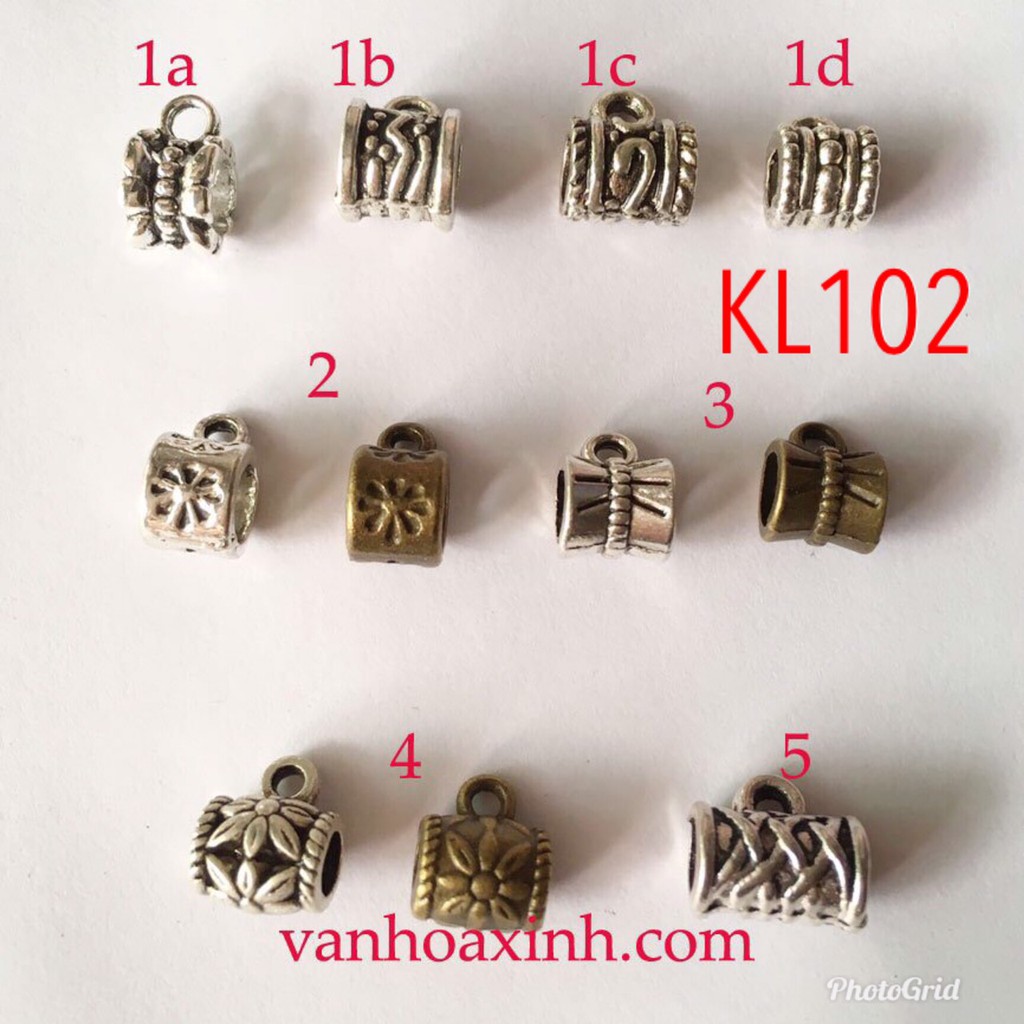 Sản phẩm làm bằng chất liệu hợp kim. Shop bán charm lỗ xỏ ngang đã gồm khoen treo vật. KL105: Dài thân 2cm, đường kính ngoài 8mm, lỗ 5mm, giá 4.5k 1 cái, có loại có lỗ móc treo và không lỗ móc treo. KL104: Dài thân 4mm, đường kính ngoài 6mm, lỗ xỏ 4mm, giá 7.6k 2 cái, nếu khách không chọn mẫu thì shop chọn ngẫu nhiên. KL103: Dài thân 1.2cm, đường kính ngoài 6mm, lỗ 3.5mm, giá 4k 1 cái. KL101: Dài thân 7mm, đường kính ngoài 6mm, lỗ 2mm, giá 6k 2 cái. Mã hàng KL102: Giá bán: 4k/ cái. Nếu khách không ghi chú chọn mẫu thì shop sẽ soạn hàng ngẫu nhiên. Mẫu 1a, 1b, 1c, 1d: Lỗ xỏ dây 4-5mm. Mẫu 2 và 5: Lỗ xỏ dây 5mm. Mẫu 3: Lỗ xỏ dây 5mm, thân dài 7mm. Mẫu 4: Lỗ xỏ dây 3.5mm, thân dài 8mm.