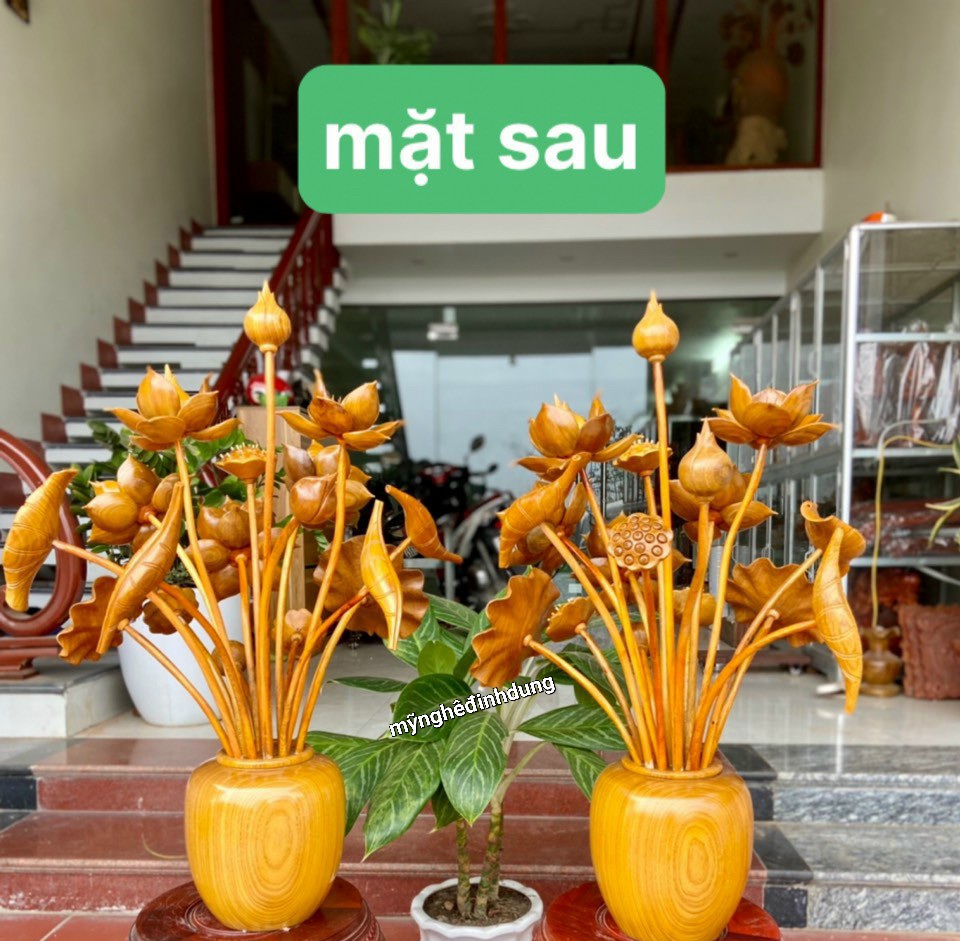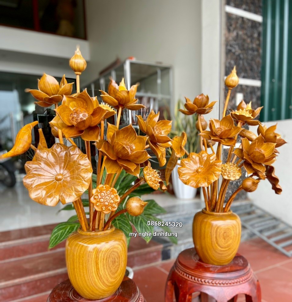 _ Bình hoa sen được chạm khắc gọt tỉa tỉ mỉ ,tinh sảo kỳ công .Đi hầu hết tất cả mọi chi tiết góc ngách nội dung hoa văn của bình hoa sen ,như bình hoa lá gương đều được gọt tỉa tỉ mỉ sắc nét hoàn toàn bằng tay thủ công .Đồng thời bình hoa được kiểm định kỹ lưỡng khắt khe ,như cho vào thẩm sấy cho gỗ khô kiệt .Mục đích trống dập nứt vênh mo mối mọt .Kết hợp với trà nhám đánh giấy giáp nhiều nước sờ mát lạnh .Song cho vào phun lót làm bóng mờ để giữ lại mầu sắc vân gỗ tự nhiên .Đẹp long lanh như ảnh trên .Bình hoa sen được làm và hoàn thiện do bàn tay khối óc tài hoa .Từ những người thợ giàu kinh nghiệm cũng như tay nghề cao trong làng nghề truyền thống .