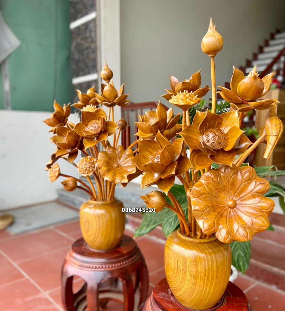 _ 1 bình hoa sen 17 cành trang trí phòng khách ,phòng bàn thờ để thờ được làm bằng chất liệu gỗ cẩm vàng tự nhiên 100%