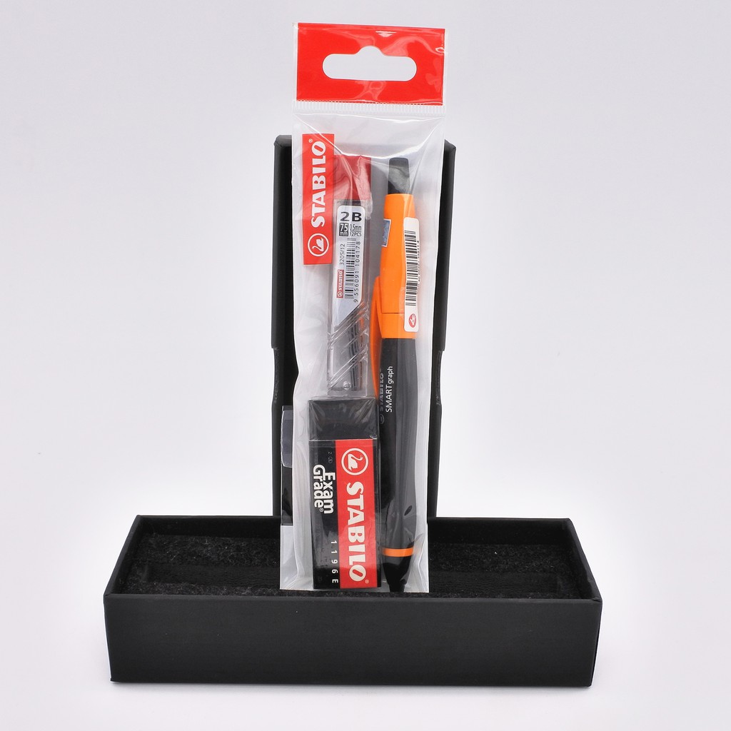 Bút chì bấm cao cấp. Nét 0.5mm Đầu bút thiết kế chịu lực, viết và ký thoải mái Thiết kế đặc biệt cho người thuận tay phải/tay trái Có gôm ở đầu bút, tẩy sạch không để lại dấu Ruột chì tinh khiết, độ đậm đều đặn, viết êm, lâu mòn, bền chắc và kinh tế Dài 75mm (ruột chì thường dài 60mm). Chịu lực tốt, khó gãy Thích hợp cho học sinh Xuất sứ: Đức Bút chì bấm STABILO SMARTgraph 0.5 Được sử dụng rộng rãi trong học tập, làm việc Bút chì là một trong những dụng cụ không thể thiếu với nhiều người, từ các em học sinh đến sinh viên, thợ mộc, họa sĩ...Bút chì bấm Stabilo SMARTgraph 0.5mm sẽ là vật dụng giúp công việc, học tập của bạn trở nên dễ dàng và thú vị hơn. Khả năng viết nhanh hơn các loại bút chì bấm thông thường Bút có thiết kế đặc biệt, sử dụng loại chì 2B kết hợp cùng kích cỡ ngòi 0.5mm, cho khả năng viết nhanh hơn các loại bút chì bấm thông thường. Loại chì cao cấp, cứng và khó gãy, do đó giúp bạn tiết kiệm hơn. Bộ lò xo bấm hiện đại bên trong hoạt động trơn tru, luôn phục vụ tốt nhất cho công việc của bạn. Thiết kế hiện đại và tiện dụng Bút chì bấm Stabilo SMARTgraph 0.5mm có kiểu dáng hiện đại và đầy thu hút, phối hợp giữa 2 màu sắc: Đen và xanh lá cây. Đầu bút được thiết kế thu gọn giúp bảo vệ ngòi không bị gãy. Đặc biệt, đuôi bút tích hợp gôm tẩy nhỏ, tiện lợi cho bạn trong quá trình sử dụng. Thân bút được làm từ nhựa chắc chắn, có độ bền cao, không hóa chất độc hại, an toàn cho người sử dụng. Nơi tì bút thiết kế lõm, đảm bảo sự thoải mái, hạn chế tình trạng tê, mỏi tay khi dùng lâu. Cài bút chắc chắn, giúp bạn kẹp gọn bút trong sổ tay, túi áo khi không dùng nữa, tránh làm rơi hay mất bút. Xuất xứ : Đức