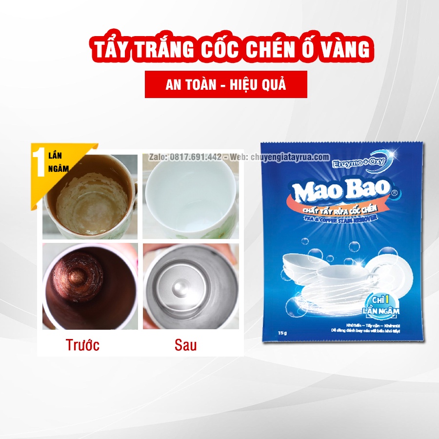 *Nên vệ sinh cốc chén 1 lần/ tuần để bảo vệ sức khỏe gia đình* _______ 1. ĐẶC ĐIỂM NỔI BẬT: - Nguyên liệu an toàn, công thức độc quyền chứa protein phân giải enzyme, natri percarbonate có thể tự phân giải, không gây ảnh hưởng môi trường. - Chuyên xử lý các vết ố vàng, vết xỉn màu, mảng bám, cặn bẩn lâu ngày từ trà, cà phê,...chỉ với 1 lần ngâm mà không cần phải cọ rửa nhiều lần. - Diệt trừ các loại vi khuẩn có hại lưu trú trong các vật dụng ăn uống hàng ngày. - Khử mùi hôi, ẩm mốc do vi khuẩn gây mùi gây ra - An toàn, tiện lợi, tiết kiệm thời gian và công sức - Không gây kích ứng da tay, không làm hại cốc chén. _______ 2. THÔNG TIN SẢN PHẨM: - Thương hiệu: Mao Bao - Nước sản xuất: Việt Nam - Sản xuất: Công Ty TNHH Mao Bảo Việt Nam - Địa chỉ: Đường số 3, KCN Long Thành, Đồng Nai, Việt Nam - Số Hotline: 0817691442 - Hương thơm: Không mùi - Cách đóng gói: Gói 15g - Thành phần: Baking soda, Sodium Lauryl Sulfate, Oxy phân tử khử bẩn (P.S.C), Protease (Enzyme) - Bộ sản phẩm gồm : 1 Gói Tẩy Rửa Cốc Chén 15g _______ 3. PHẠM VI SỬ DỤNG: - Vật dụng bằng thủy tinh: Các loại hộp đựng, ấm trà, các loại cốc, chén, dĩa bằng thủy tinh,… - Vật dụng bằng kim loại, inox: Các loại dụng cụ nhà bếp bằng kim loại, bình giữ nhiệt, bình trà cà phê, dao trong máy xay, lưới lọc pha trà, muỗng nĩa… - Vật dụng bằng gốm, sứ: Cốc cà phê, tách đựng trà, dụng cụ ăn uống, gốm chịu nhiệt, vật dụng có tráng men,… - Vật dụng bằng nhựa: Ly, tách, chén, dĩa, hộp đựng thức ăn bằng nhựa các loại. _______ 4. CÁCH SỬ DỤNG: - Bước 1: Đổ 1 gói Chất Tẩy Rửa Cốc Chén vào 3 lít nước ấm, rồi khuất tan.