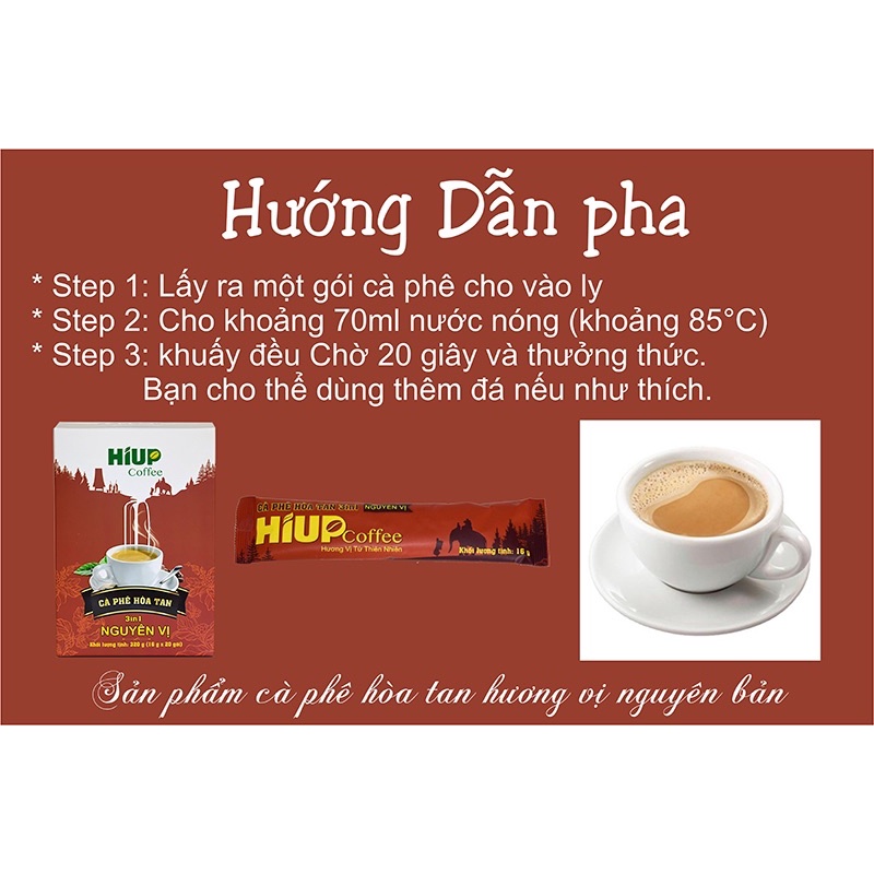 Hiup Coffee Xuất xứ thương hiệu: Việt Nam Hạn sử dụng: 18 tháng Hướng dẫn sử dụng -Dùng nóng: Cho một gói Cà phê hòa tan 3in1 Hiup Coffee vào tách, thêm 80ml nước nóng (80oC - 100oC) vào khuấy đều và thưởng thức. -Dùng lạnh: Nên pha hai gói Cà phê hòa tan 3in1 Hiup Coffee với 80ml nước nóng và thêm đá. Trọng lượng: 16gr/ gói