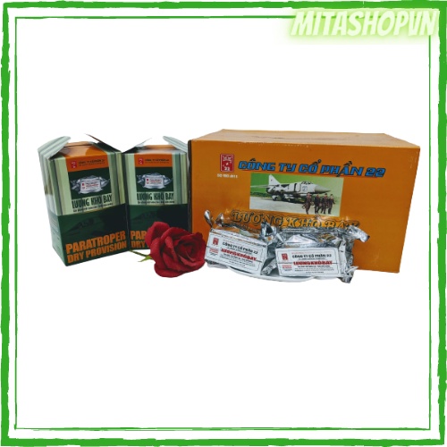 LƯƠNG KHÔ BAY Sản xuất đặc biệt dành cho các phi công, không quân của quân đội Việt Nam. Lương khô Bay có giá trị dinh dưỡng cao, được dự phòng sử dụng dài ngày nếu máy bay có sự cố… Bao gồm: Bơ, Bột đậu xanh, Sữa bột, Sữa đặc có đường, Dầu thực vật… Hạn sử dụng: 12 tháng
