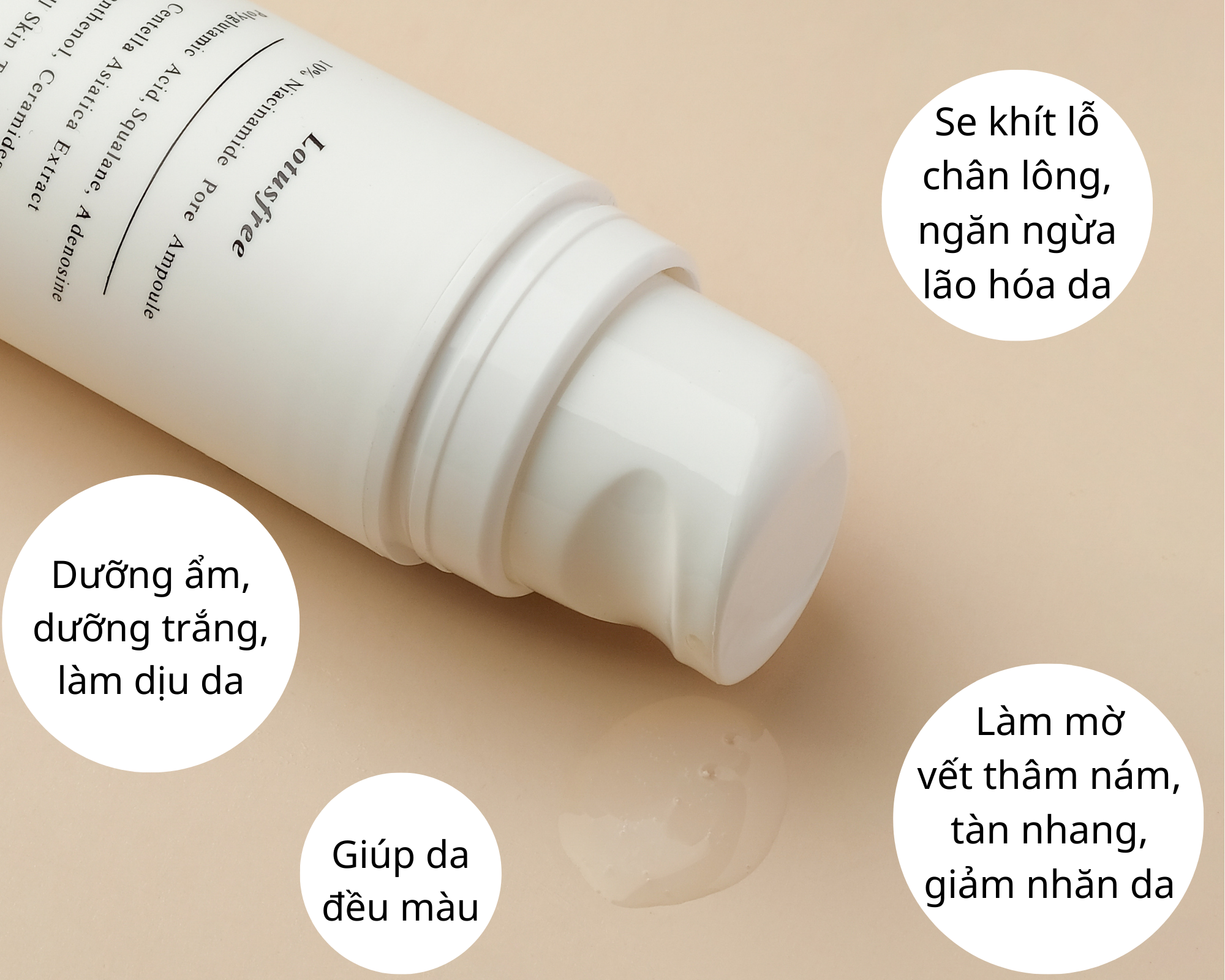 Công dụng: Dưỡng ẩm da, giúp làm dịu da, dưỡng trắng da, giúp làm mờ vết thâm nám, tàn nhang, giúp da đều màu, giảm nhăn da, se khít lỗ chân lông, giúp ngăn ngừa lão hóa da.