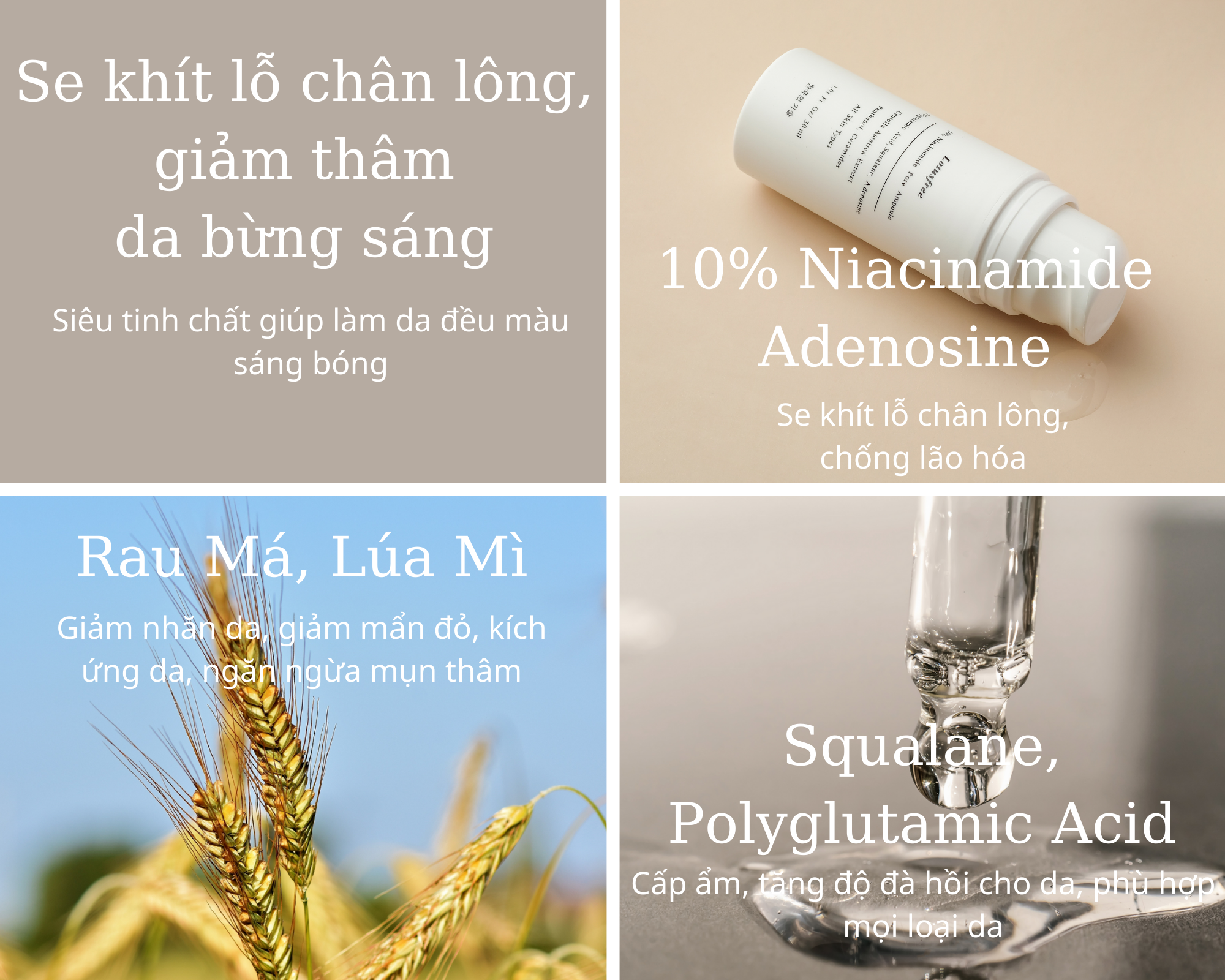 Thành phần | AQUA, NIACINAMIDE, BUTYLENE GLYCOL, GLYCERIN, PROPANEDIOL, CYCLOPENTASILOXANE, PHENYL TRIMETHICONE, ARGANIA SPINOSA KERNEL OIL, PANTHENOL, ALLANTOIN, SODIUM HYALURONATE, TOCOPHEROL, ADENOSINE, SACCHARIDE ISOMERATE, CERAMIDE NP, SQUALANE, CENTELLA ASIATICA EXTRACT, MACADAMIA INTEGRIFOLIA SEED OIL, HYDROXYETHYL ACRYLATE/SODIUM ACRYLOYLDIMETHYL TAURATE COPOLYMER, CREATINE, ETHYLHEXYLGLYCERIN, PHENOXYETHANOL, AMMONIUM ACRYLOYLDIMETHYLTAURATE/VP COPOLYMER, HYDROGENATED POLYDECENE, POLYGLUTAMIC ACID, LECITHIN, XANTHAN GUM, CAPRYLIC/ CAPRIC TRIGLYCERIDE, DISODIUM EDTA, POTASSIUM SORBATE, SODIUM BENZOATE, ALCOHOL, POLYSORBATE 80. |