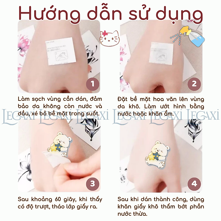 ***Lưu ý: Xăm giữ được khoảng 2 -3 ngày, nếu quý khách muốn xóa xăm liền thì có thể dùng cồn hoặc chà mạnh với xà phòng.