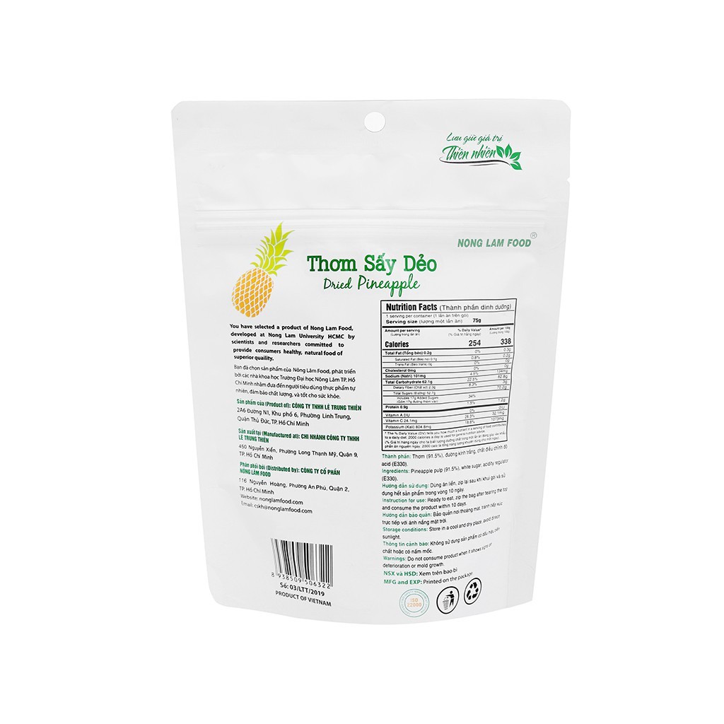 - Loại sản phẩm: Thơm sấy dẻo - Dạng sấy Sấy dẻo - sử dụng nhiệt độ cao (50 - 70 độ C) để làm mất đi một phần hơi nước của sản phẩm rồi đem đi làm mát - Đặc tính Dẻo, mềm, hơi dai - Năng lượng 338kcal/100g - Khối lượng 75g - Thành phần: Thơm (91.5%), đường kính trắng, chất điều chỉnh độ acid (E330) - Thương hiệu: Nong Lam Food (Việt Nam)