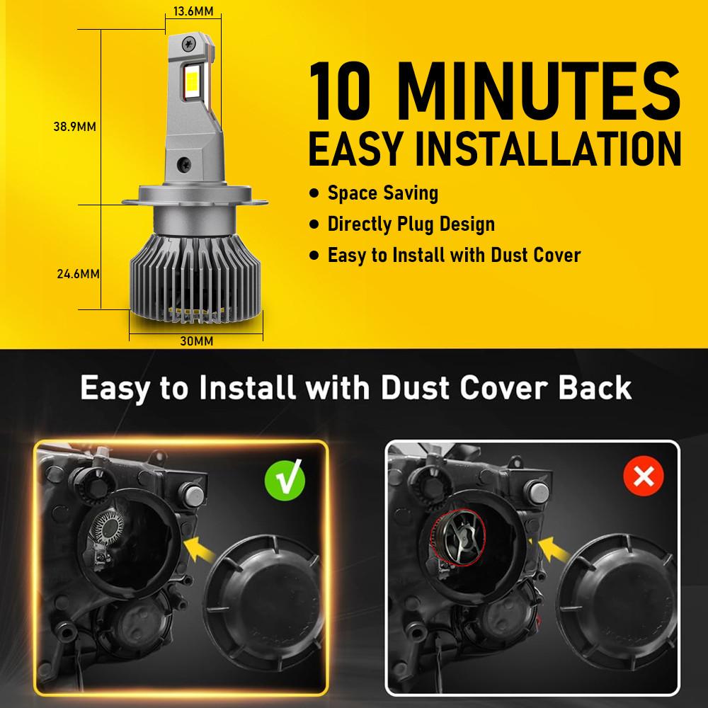 2 Bóng Đèn Cos Pha LED VinFast VF5 / VF5 Plus LED H7 Đèn Pha/ Cos - Trắng 6000K / 90W - 160W Tất cả mới Kích thước nhỏ 1: 1 Độ sáng cao Thông số: * Điện áp: DC 12V * Ổ cắm: H7 * Loại Chip: Bộ Chip LED 7535 * Công suất: 2 loại tùy chọn - Loại rẻ: 45W/ bóng và 90W/ cặp - Loại đắt: 80W/ bóng và 160W/ cặp * Lumin: 20000LM / 1 cặp * Nhiệt độ màu: 6000K Trắng tinh khiết / 4300K Trắng ấm * Thiết kế: Thiết kế tất cả trong một với quạt làm mát, có chức năng canbus * Nhiệt độ làm việc: -40 ° C + 85 ° C * Tuổi thọ: ≥ 30.000 giờ * Nguyên lý tản nhiệt: nhôm máy bay 6063 * Khe kẹp: một kẹp kim loại chắc chắn có thể xoay 360 độ° Để điều chỉnh chùm tia * Bảo hành: 1 năm * Gói bao gồm: 2 bóng đèn pha LED Tính năng 1. “Kích thước nhỏ, Thiết kế 1: 1 ” Thiết kế kích thước 1: 1, Plug and Play, dễ dàng cài đặt. 2. “Sáng hơn 300% ” Bộ chip LED 7535, Bóng đèn 50W / 1, Bóng đèn 11000LM / 1, sáng hơn 300% so với halogen origianl. 3. “Tản nhiệt nhanh ” Quạt làm mát tốc độ cao, 10.000RPM; Chất liệu hợp kim nhôm; 1 ống dẫn nhiệt chân không bằng đồng 3.0 mm. 4. “Ổn định & Bền bỉ ” Trình điều khiển bên ngoài được nâng cấp, đảm bảo tuổi thọ lâu hơn. Kiểm soát nhiệt độ bên trong; Không can thiệp; Quyền lực ổn định; Không có lỗi. 5. “Tuổi thọ 30.000 giờ ” Tiết kiệm tiền, tiết kiệm thời gian. Công suất cao: 50W / 1 Bóng Đèn ; Siêu sáng: 22000 LM / 1 cặp ; 6000K Trắng tinh khiết / 4300K Trắng ấm Sáng hơn 300% so với halogen: Để nhìn xa hơn và rộng hơn 6000k Trắng tinh khiết / 4300K Trắng ấm cho bạn lựa chọn Mẫu chùm hoàn hảo: Không cản trở giao thông sắp tới; Không chói mắt cho các trình điều khiển khác 10 phút cài đặt dễ dàng: Tiết kiệm không gian; Thiết kế cắm trực tiếp; Dễ dàng cài đặt với nắp che bụi