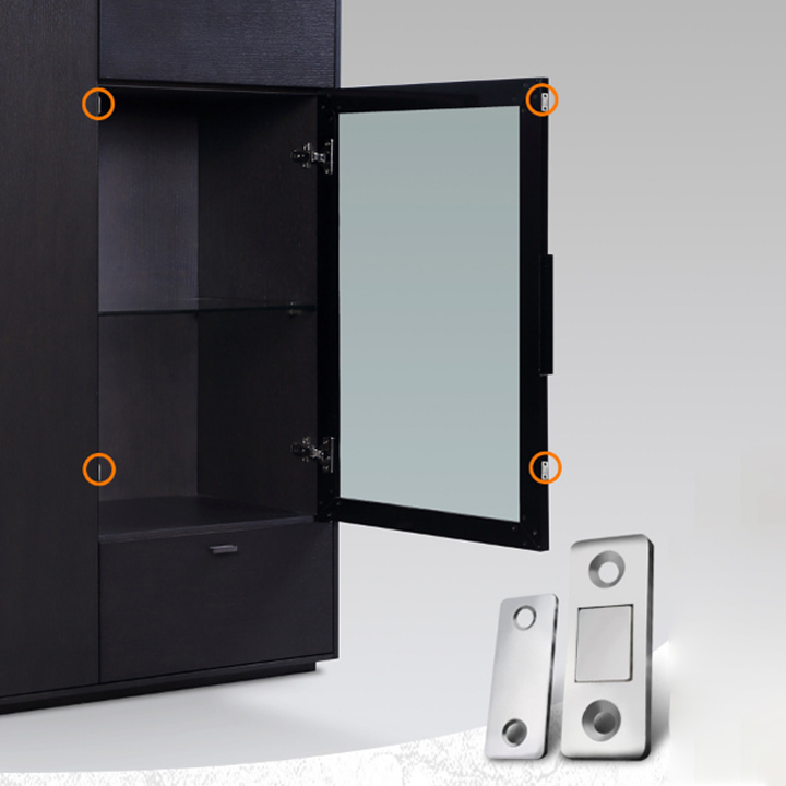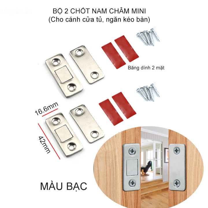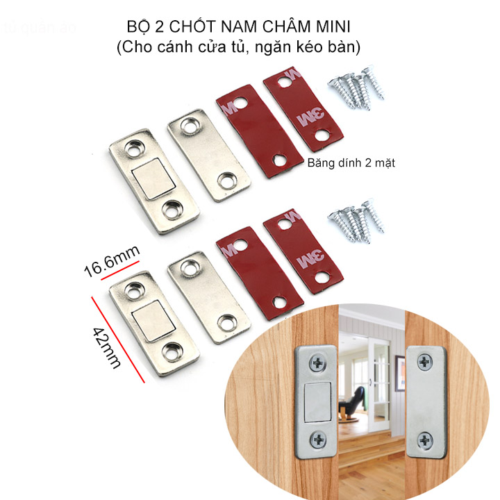 Bộ 2 chốt nam châm mini được thiết kế nhỏ gọn, mỏng với lực hút nam châm mạnh, dùng giữ cánh cửa tủ bát, tủ cá nhân, tủ quần áo, cánh cửa trượt các loại, ngăn kéo bà Sản phẩm có kèm theo băng dính 2 mặt và vít giúp dễ dàng lắp đặt
