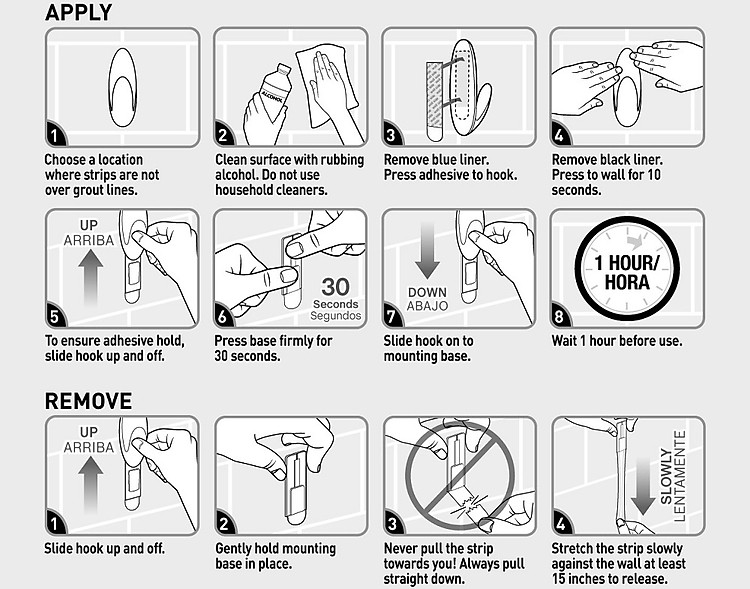 | Hướng dẫn sử dụng | Bước 1: lau sạch bề mặt bằng cồn, lau nhẹ, chờ khô (không dùng chất tẩy rửa)Bước 2: tháo miếng lót màu đỏ ra dán vào mặt sau của mócBước 3: tháo miếng lót màu đen ấn mạnh vào bề mặt và để trong vòng 30 giâyBước 4: chờ trong vòng 1h trước khi sử dụngCách tháo bỏ:Giữ chắc và kéo thẳng dài xuống theo tường ít nhất 30cm cho đến khi nền móc và dây keo được tách rời hẳn ra |