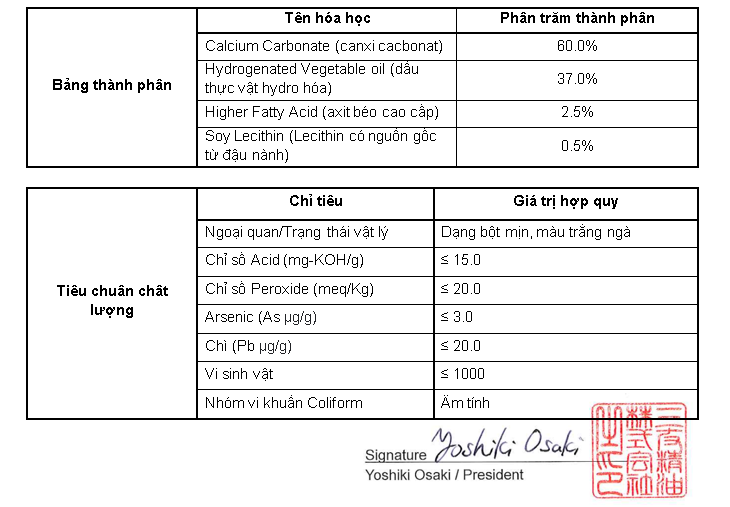 | Thành phần | : Calci carbonat (INS 170i) (60%); Mono và diglycerid của các acid béo (INS 471) (2.5%); Dầu và chất béo thực vật (INS 479) (37%); Lecithin (322i) (0,5%). |