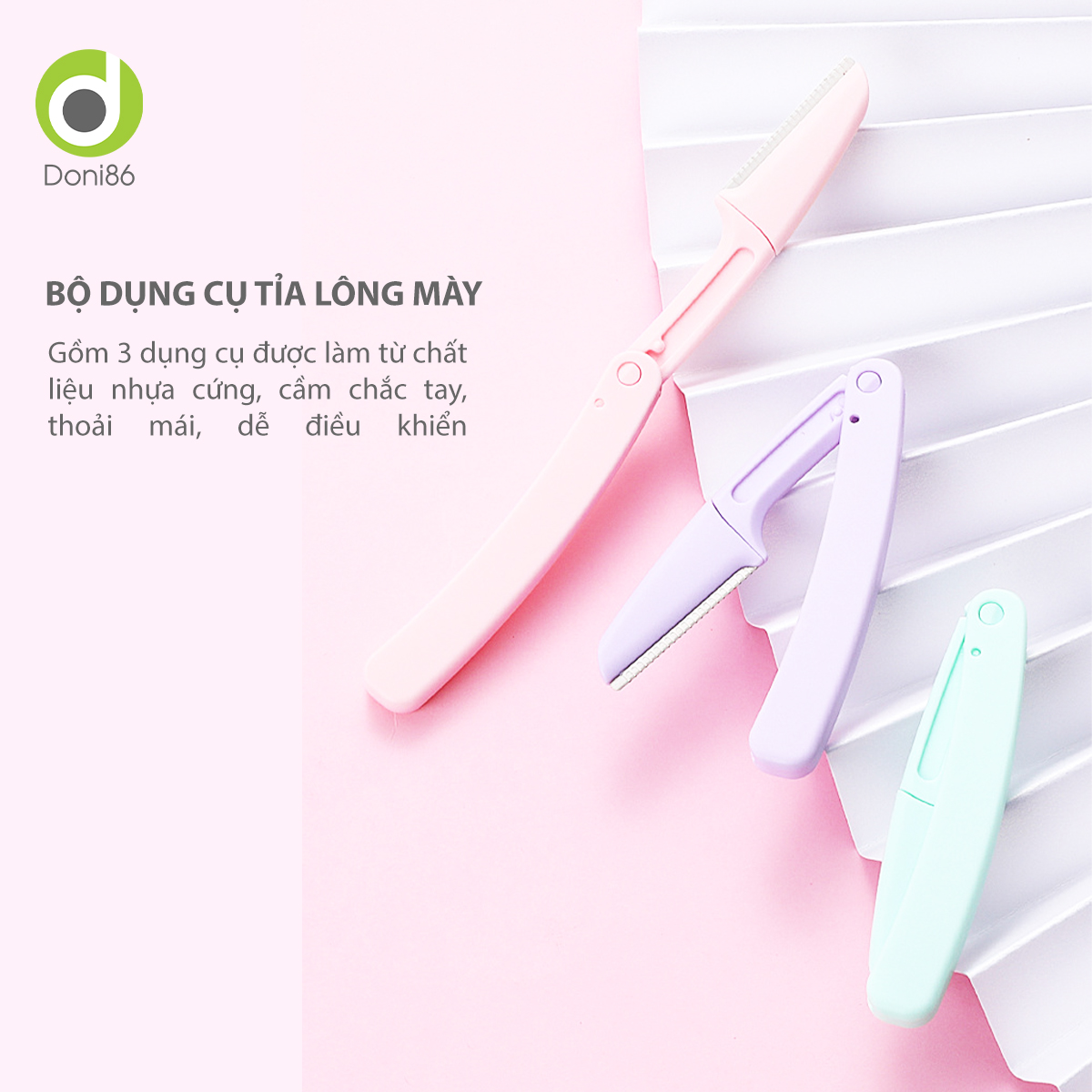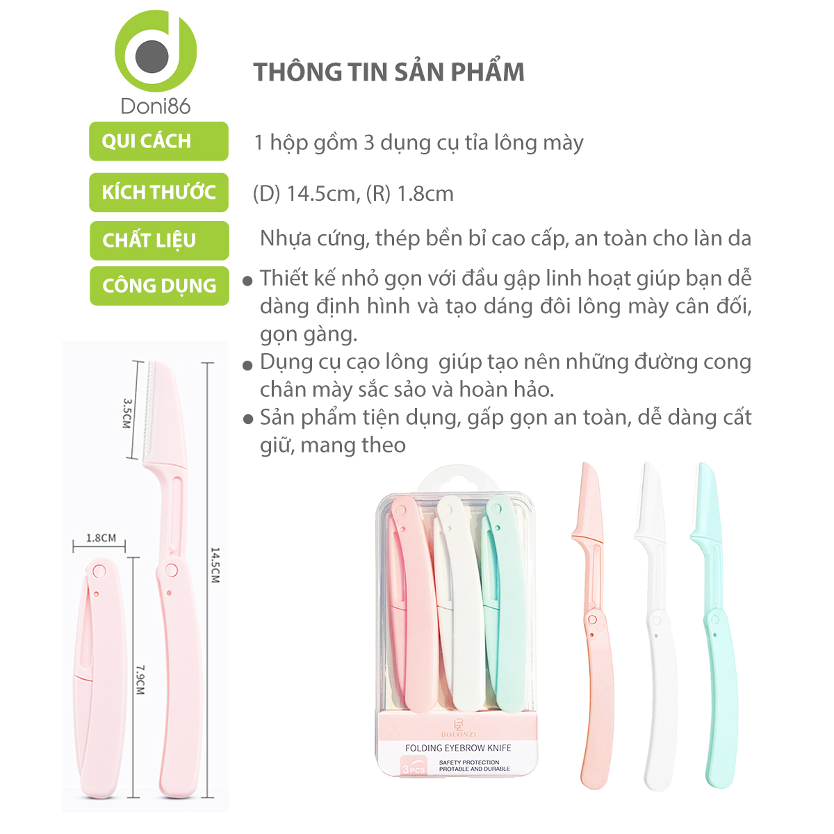 Bộ dụng cụ tỉa lông mày gồm 3 dụng cụ được làm từ chất liệu nhựa cứng, lưỡi dao bằng thép không gỉ sắc bén, độ bền cao.
