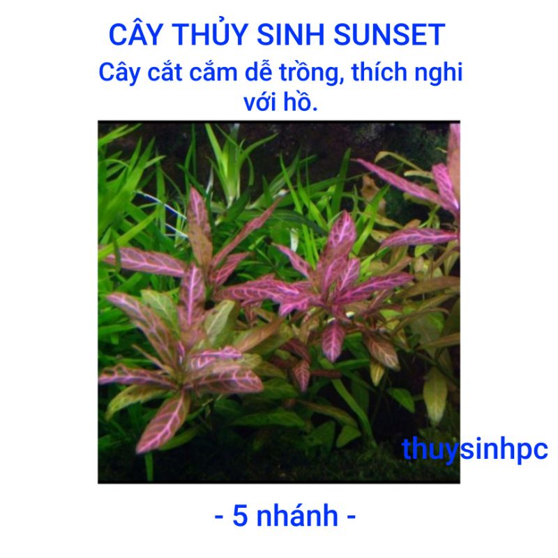 không cần c02 và nền Sunset được biết đến với vai trò cây thủy sinh cắt cắm, đảm nhiệm 2 vị trí đó là trung cảnh và hậu cảnh, đây cũng là mẫu cây thường xuất hiện trong hồ thủy sinh Hà Lan. Khi sống trong môi trường đầy đủ dinh dưỡng và các điều kiện khác như ánh sáng, co2 cây Sunset sẽ có những khoang đốm ửng hồng rất đẹp, đây cũng chính là đặc điểm nổi bật nhất của dòng cây thủy sinh này. Để cây có màu sắc tươi, các gân trên lá nổi rõ rệt bạn nên sử dụng một cây đèn màu có độ quang phổ chuẩn như rgb của chihiros, flat one…