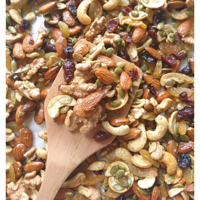 Thành phần: Hạnh nhân (nguyên hạt), óc chó, hạt điều, nam việt quất, nho vàng, hạt bí xanh, mật ong