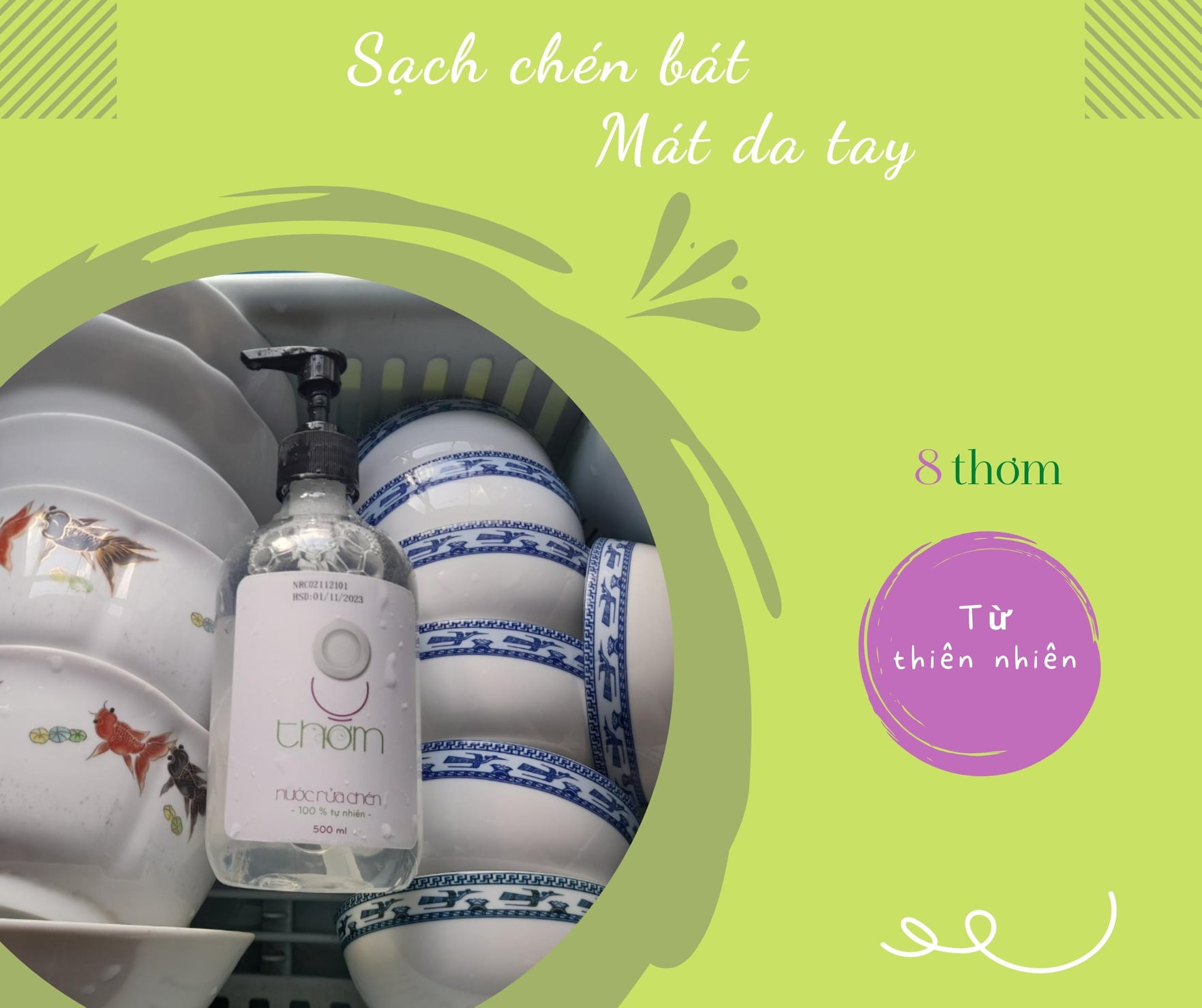 8 THƠM là nước rửa chén 100% thành phần thiên nhiên, an toàn cho sức khỏe - tiết kiệm nước - thân thiện với môi trường.Thành phần: Water (Nước); Cocamidopropyl betaine & Potassium Cocoate (từ dầu dừa hữu cơ); Axetic (Từ thực vật); Sodium Chloride (Muối); Ocimun grastissimum & Peppermint Esential oil (Tinh dầu Hương Nhu & Bạc Hà tự nhiên)Vì sao lại là 8 THƠM:- Vì 8 còn đọc là bát. Nước rửa chén bát thơm với mùi hương thiên nhiên, cho bát đĩa nhà bạn sạch tinh, thơm mát.- 8 thơm cũng là tên một loại gạo gợi nhắc đến bữa cơm gia đình với bát cơm thơm dẻo, vị ngọt đậm ngon cơm.- Và số 8 theo quan niệm của người Việt nghĩa là tốt đẹp.Với chừng ấy ý nghĩa, mong gia đình bạn sẽ có chén bát sạch thơm, mâm cơm đầm ấm. Mong rửa chén sẽ không còn là việc bắt buộc phải làm mà trở thành niềm vui, những đôi tay làm việc nhà ngày càng mềm thơm dịu dàng. Và hơn hết, Nhà cũng như bạn hiểu rằng ăn sạch - uống sạch thôi chưa đủ, ngay cả nước rửa chén cũng cần xanh - sạch - tự nhiên.8 lý do bạn nên chọn nước rửa chén bát 8 THƠM không chất tạo đặc, không Paraben, không Sulfate, Không hương liệu tổng hợp:- Thành phần tự nhiên làm sạch từ giấm lên men từ thực vật đa dạng (gạo, hoa quả, đường…), tạo bọt từ dầu dừa hữu cơ, thơm hương tinh dầu thiên nhiên dịu nhẹ.- KHÔNG chât tạo đặc, KHÔNG paraben. KHÔNG Sulfate. KHÔNG hương liệu tổng hợp.- Độ tạo bọt tự nhiên từ dầu dừa hữu cơ cực tốt, khi kết hợp cùng xơ mướp tạo thành bộ đôi thiên nhiên hoàn hảo.- Rửa sạch, không lưu mùi trên chén bát nên rất tiết kiệm nước khi rửa vì không cần tráng lại nhiều lần. Nhiều bọt, sạch nhanh.- Thân thiện với da tay, không gây nhơn dính trên da sau khi rửa, không làm khô da.- Hương thơm tinh dầu bạc hà hương nhu cực kì dễ chịu và thư giãn, đặc biệt với người dị ứng mùi hương liệu tổng hợp.- Thân thiện với môi trường, không gây hại cho nguồn nước và môi trường sống xung quanh.Hạn sử dụng: 2 năm kể từ ngày sản xuất.