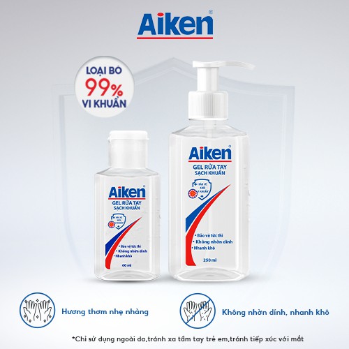 Gel Rửa Tay Aiken Sạch Khuẩn được đánh giá là một trong những nhãn hiệu chuyên về các sản phẩm sạch khuẩn hàng đầu với nhiệm vụ bảo vệ sức khỏe cho người tiêu dùng. Sản phẩm gel rửa tay Aiken sạch khuẩn đã nhanh chóng ra mắt tại thị trường Việt Nam nhằm đáp ứng nhu cầu rửa tay mọi lúc mọi nơi của người tiêu dùng, giúp vệ sinh đôi tay sạch sẽ một cách tiện lợi trong điều kiện thiếu xà phòng và nước sạch.