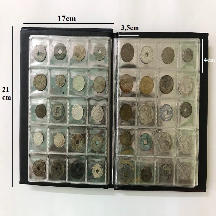 Kích thước của album 200 xu là: 21x17x1,5cm (Dài x Rộng x Cao). Kích thước ngăn đựng xu: gồm 200 ngăn với kích thước 4x3,5cm (Dài x Rộng).