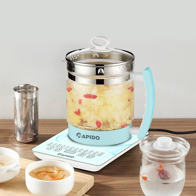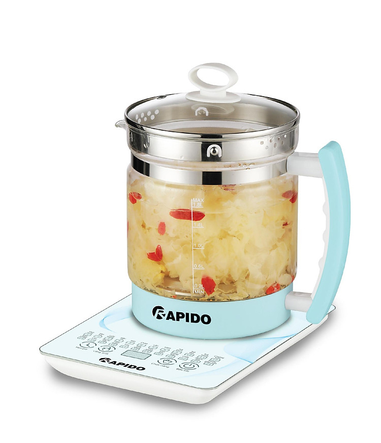 Không đơn thuần là ấm đun nước thông thường, ấm điện đa năng Rapido với 24 chế độ nấu tự động sử dụng dễ dàng, nhanh chóng và tiện lợi. Ngoài chức năng nấu nước ấm điện đa năng Rapido còn là ấm pha trà, cà phê tự động, nồi hầm các món dinh dưỡng yêu cầu thời gian dài như sắc thuốc bắc, hầm cháo, chưng yến ….hay nồi đa năng tiện dụng dành riêng cho dân văn phòng như nấu mì, nấu súp, nấu lẩu, và các món tráng miệng như sữa chua, chè,… hâm đồ ăn nhanh tiện lợi mà không cần tới lò vi sóng, không sợ sóng viba ảnh hưởng tới sức khỏe: hâm sữa, hâm đồ ăn thừa,…