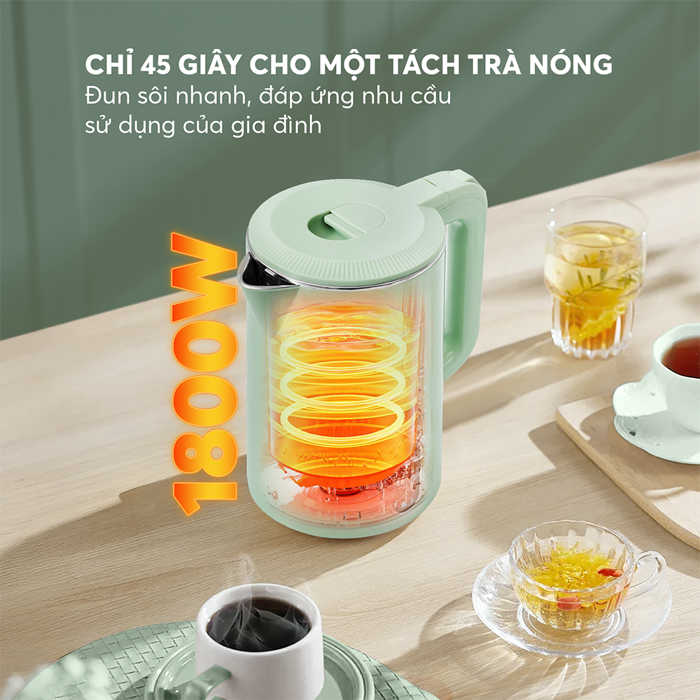 Với công suất cao, ấm giúp đun sôi 1.7 lít nước chỉ trong 5–7 phút, tiết kiệm thời gian tối đa, đáp ứng nhanh nhu cầu pha trà, cà phê hay nấu nước hằng ngày.