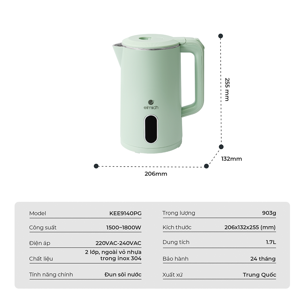 Ấm Đun Siêu Tốc Elmich KEE9140 1500-1800W 1.7L, Hàng Chính Hãng, Sôi Nhanh 45s - JoyMall