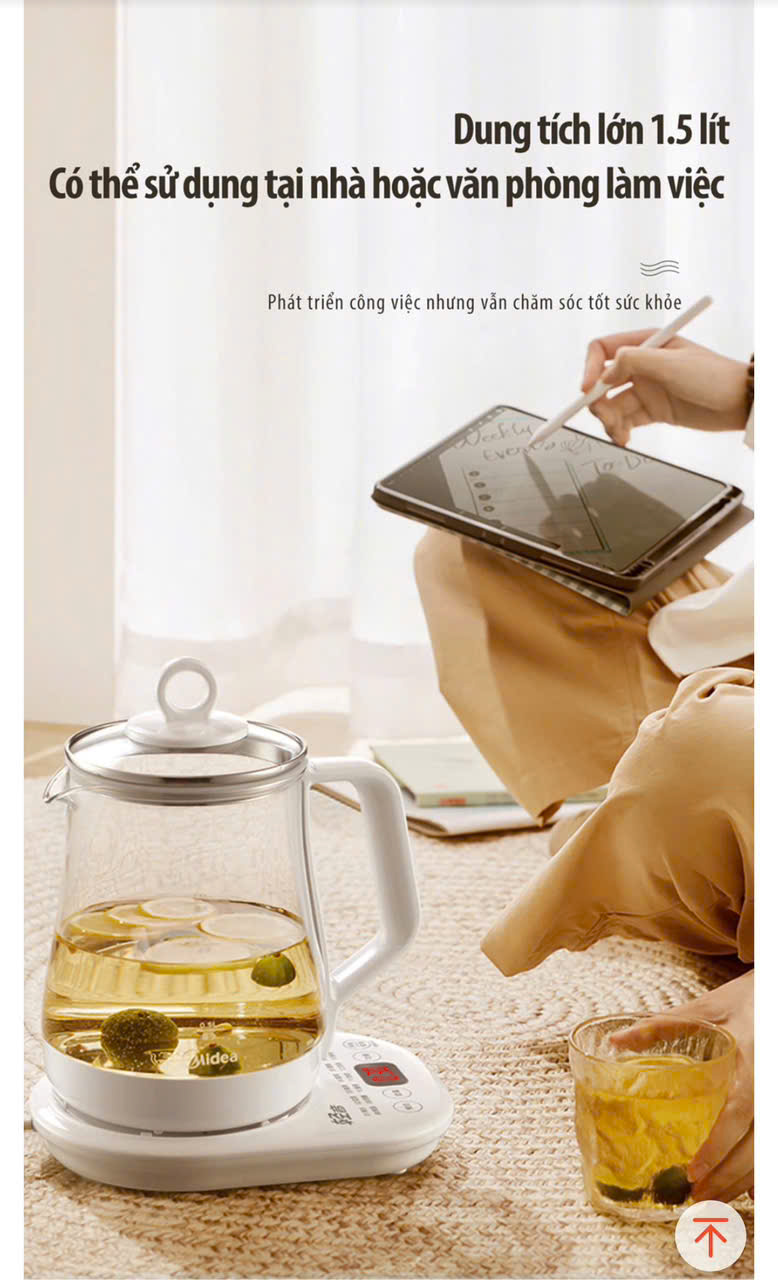 - Thân bình bằng thủy tinh, chịu được nhiệt độ cao và an toàn - Màn hình thông minh hiển thị trạng thái nấu mọi lúc TÍNH NĂNG SẢN PHẨM - 14 chức năng nấu, chế biến đa dạng các thực phẩm chăm sóc sức khỏe, phù hợp với cả người không biết nấu ăn - Công nghệ chuyển đổi tần số thông minh giữa mức nhiệt nhỏ và lớn. - Thiết kế tinh tế, bảo quản và giữ nhiệt thông minh, chăm sóc chu đáo để bảo vệ cuộc sống khỏe mạnh. - Tản nhiệt đều, giúp không bị cháy, hầm lửa nhỏ - Hầm ở công suất lớn lên tới 800W - Hẹn giờ giữ nhiệt hoạt, bạn không phải lúc nào cũng phải chờ đợi để thưởng thức những món ăn ngon. Ấm dưỡng sinh thông minh Midea sẽ giải quyết tất cả các vấn đề của bạn.Dung tích lớn 1.5L
