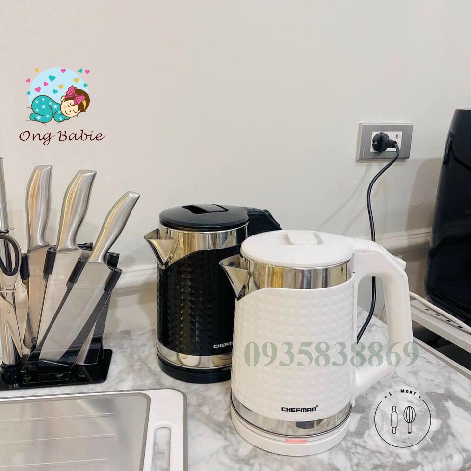 ☑️ƯU ĐIỂM : - Chefman CM-720 thiết kế màu sắc đa dạng: Đen và nâu cho Khách hàng lựa chọn phù hợp với sở thích. Ấm siêu tốc có dung tích lên tới 2 lít giúp đun được lượng nước lớn, đáp ứng nhu cầu sử dụng nước nhiều và thường xuyên cho gia đình đông người. - Ấm siêu tốc Chefman CM-720 được chia làm 2 lớp: - Lớp trong cùng bằng inox 304 cực kỳ an toàn cho sức khỏe, chịu nhiệt tốt. - Lớp vỏ bằng nhựa PP chịu nhiệt tốt, không mùi, không sinh ra chất độc hại, độ bền cao. - Nút nhấn mở nắp được tích hợp luôn trên nắp ấm. Tay cầm tích hợp công tắc bật/tắt ấm. Tay cầm chắc chắn, dễ di chuyển rót nước. Đế tiếp điện thiết kế tháo rời giúp nhấc ấm lên từ mọi hướng dễ dàng. - Ấm siêu tốc Chefman CM-720 hoạt động với công suất 1500W, sử dụng nguồn điện áp 220V/50Hz giúp đun nước sôi rất nhanh, chỉ sau vài phút là đã có nước nóng để pha mì, pha trà hay pha sữa cho bé.... - Bình đun nước siêu tốc Chefman có kích thước là 21cm x 16,8cm x 23cm, đặt bàn không tốn nhiều diện tích.