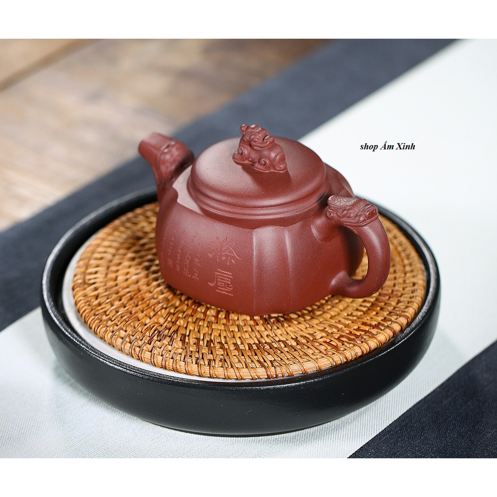 Dáng Ấm: Bát Phương Hoa văn 02 mặt ấm: Khắc chìm hình ảnh non nước hữu tình Lọc: Đa khổng 13 lỗ Kích thước: Tổng chiều dài của ấm: 15.0cm Cao: 7.8cm Đường kính nắp ấm 5.4cm Dung tích:300ml +/- 10ml Chất liệu: Chu Sa Nghệ nhân: Sifang Longzun - Giang Tô, Trung Quốc - có triện trên thành ấm bên trong, đáy ấm, quai ấm, 2 triện dưới nắp ấm Phương thức chế tác: Thủ công toàn chế Sản phẩm bao gồm Giấy chứng nhận xuất xứ của Nghệ nhân để trong ấm và Hộp đựng. Ấm tử sa Nghi Hưng có gì đặc biệt? Ấm tử sa là một loại ấm pha trà được làm bằng đất đặc biệt, chúng được nung ở nhiệt độ cao và không tráng men. Về căn bản ấm được gọi là tử sa vì loại ấm này thường có màu tím, xuất phát từ vùng Nghi Hưng, Trung Quốc.