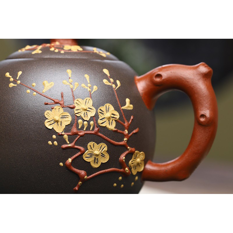 Hoa văn 02 mặt ấm: đắp nổi họa tiết hoa mai Lọc: lọc đa khổng 09 lỗ, đảm bảo nước chảy mạnh không bị tắc, ngắt nước tốt (đã kiểm tra) Kích thước ấm: Tổng chiều dài: 13.2 cm * chiều cao 9.5 cm * Rộng nắp ấm 5.2 cm Dung tích: 280 ml+/- 05 ml (dung tích vừa phải cho các Trà hữu) Chất liệu: nguyên khoáng Đoạn Nê, Thiên Thanh Nê Thương Hiệu/Nghệ nhân: Thẩm Quốc Cường - 沈国强 , mã số giấy chứng nhận trong bộ sưu tập: GJT/1846, xuất xứ: Nghi Hưng, Trung Quốc Tên tác phẩm: Báo Xuân Hoa Số triện: Triện dưới đáy ấm, quai ấm, thành ấm bên trong và nắp ấm. Sản phẩm bao gồm Giấy chứng nhận xuất xứ của Nghệ nhân để trong ấm và Hộp đựng.