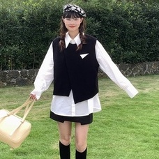 Giới thiệu {Amanda}Set áo sơ mi dáng dài kèm gile cổ tròn vạt chéo ngực điệu sang chảnh cúc vai A.265