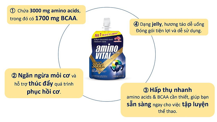 Thức uống aminoVITAL có dạng thạch lỏng, chứa hàm lượng cao Amino Acids (3,000mg) với hơn 50% những Amino Acids quan trọng chính là BCAAs (Amino Acids mạch nhánh - gồm 3 loại Amino Acids thiết yếu mà cơ thể không tự sản xuất là: L-leucine, L-isoleucine, và L-valine), đóng vai trò quan trọng cấu tạo nên protein cơ.