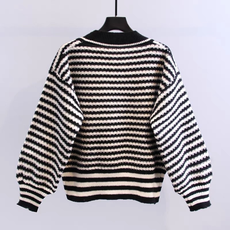 Giới thiệu [Ảnh thật] Áo cardigan len kẻ sóng ngang, áo khoác len cổ v dáng vest dài tay đóng khuy phong cách hàn quốc