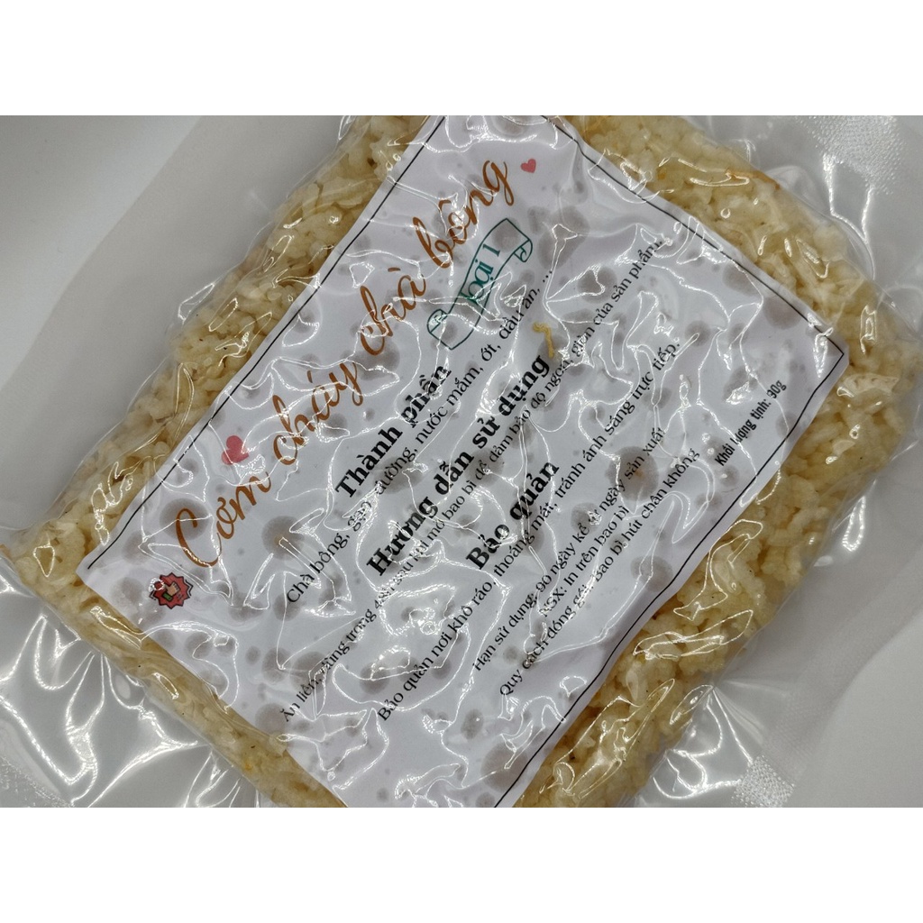 - Thành phần: Cơm cháy, chà bông, Muối, Ớt, Dầu ăn, Gia vị,.. - Hướng dẫn sử dụng: Dùng ăn trực tiếp - Hướng dẫn bảo quản: Nhiệt độ thường - Trọng lượng tịnh: 90g (tính cả bao bì) - Hạn sử dụng: 03 tháng kể từ ngày sản xuất, In trên bao bì Cơ sở sản xuất cơm cháy chà bông Q1- Sài Gòn. nhận gia công sản phẩm theo yêu cầu khách hàng.