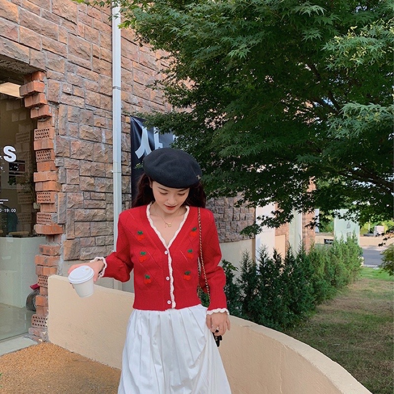 Giới thiệu [ Ảnh Thật- Hàng Qc Sẵn ]Áo Khoác Len Cadigan Dệt Kim Tay Dài Cổ Chữ V Hoạ Tiết Cherry 3 Màu Phong Cách Hàn Quốc