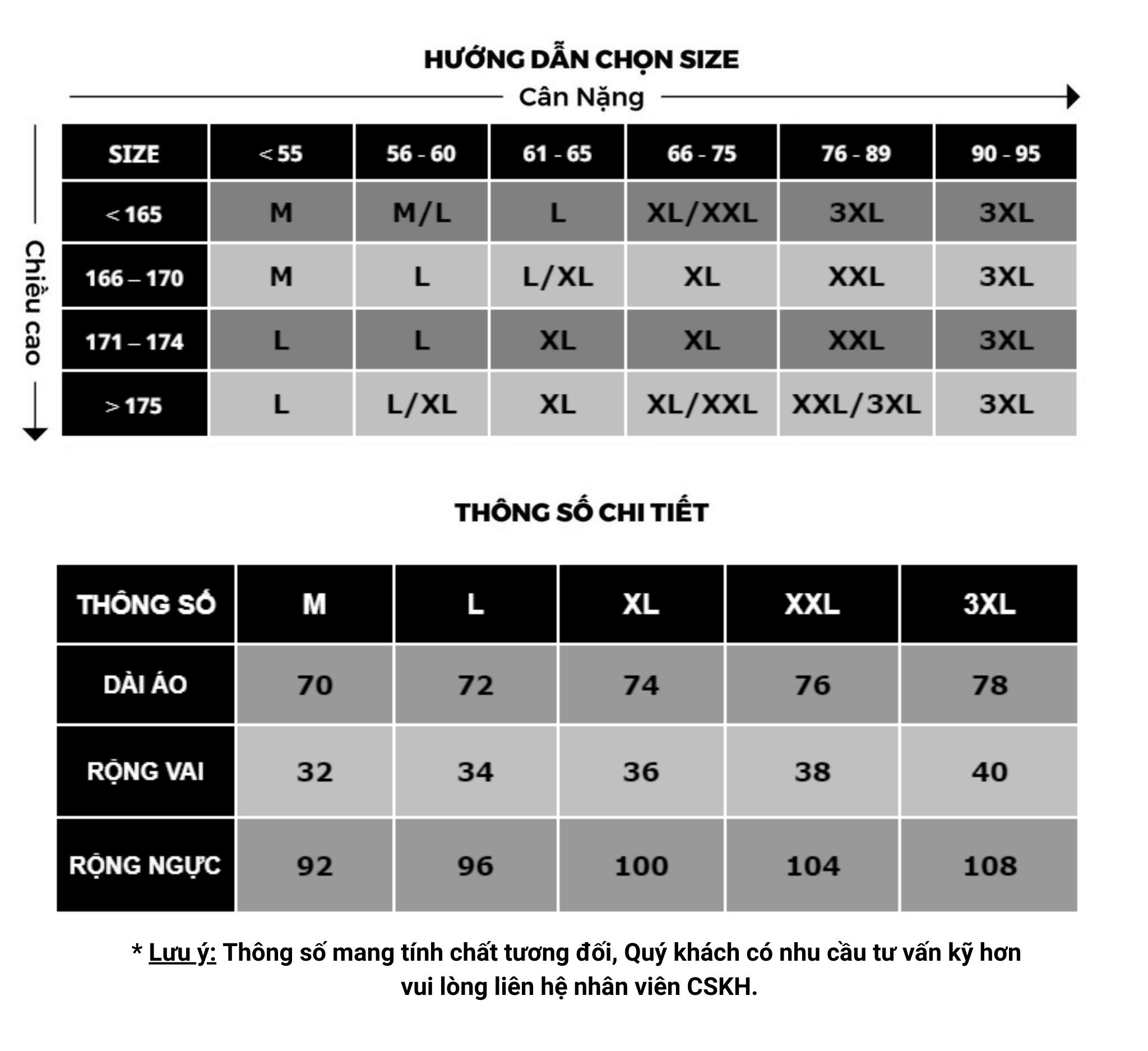 | Kích thước | M (<62kg), L (63 - 70 kg), XL (71 - 80 kg), 2XL (80 - 90 kg), 3XL (91 - 100 kg) |
