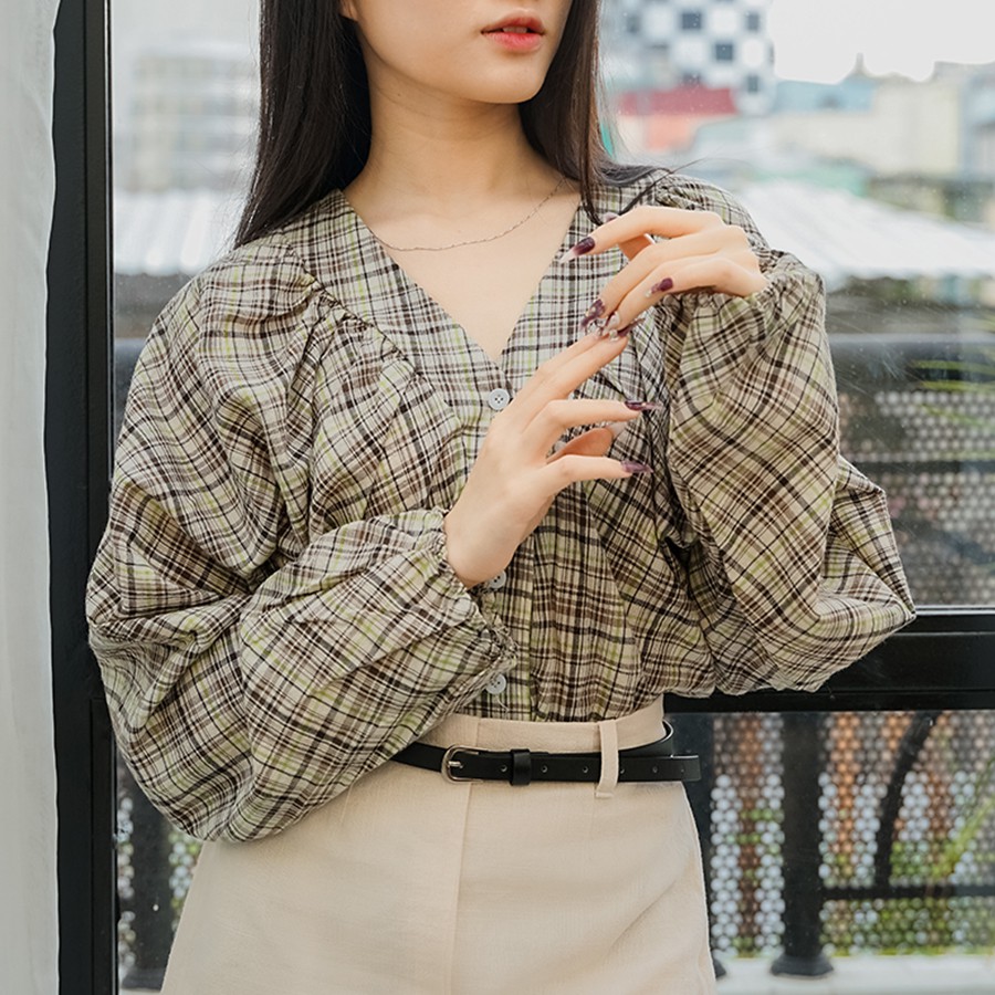 Áo Blouses Vải Chun Sọc Caro ENVYLOOK Sherring Check Blouse
