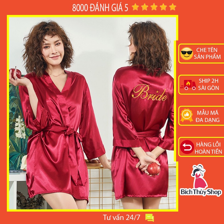 Thời trang Bích Thùy Shop cam kết sản phẩm y hình, giống y mô tả. - Mô tả sản phẩm & chất liệu: + Sản phẩm bao gồm : Áo choàng ngủ + Dây thắt eo + Mô tả: Thiết kế áo choàng kiểu kimono in chữ Bride sang trọng. Áo được thiết kế tay lỡ cùng form rộng thoải mái tạo cảm giác tự do không bó vào cơ thể. Kiểu dáng mới lạ và ấn tượng giúp chị em trở nên hấp dẫn, ngọt ngào hơn trong mắt đấng mày râu. *.* T kế đơn giản nhẹ nhàng nhưng vẫn toát lên được nét sang trọng và quyến rũ của người mặc. Rất thích hợp làm quà cưới hoặc dành cho cô dâu diện choàng ngủ chụp phóng sự cưới với hội bạn thân lưu giữ kĩ niệm đẹp ❤️ + Chất liệu: Phi lụa - Màu sắc: Trắng - Hồng - Đỏ đậm - Hướng dẫn chọn size: Free size (dưới 65kg tùy chiều cao). Liên hệ shop để được tư vấn size chính xác Nàng nhé! - Độ dài áo choàng: 92cm nếu cao m6 mặc dài tầm ngang gối. Mẫu cao trên m68 nên mặc ngang đùi ạ ^.^ - Lưu ý: Màu sắc đầm bên ngoài có thể đậm hoặc nhạt hơn hình mẫu mặc xíu do ảnh hưởng của ánh sáng khi chụp và độ phân giải khác nhau giữa các dòng máy Nàng nhé ^.^