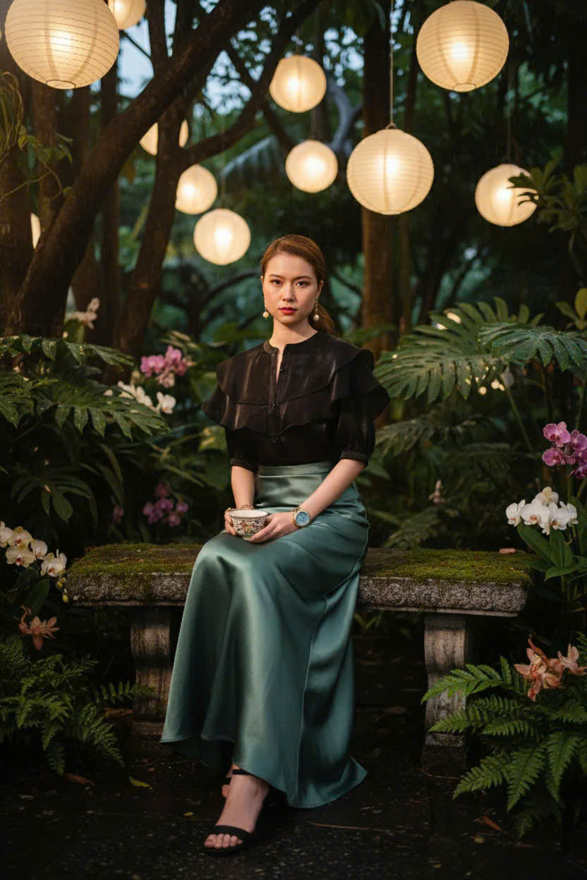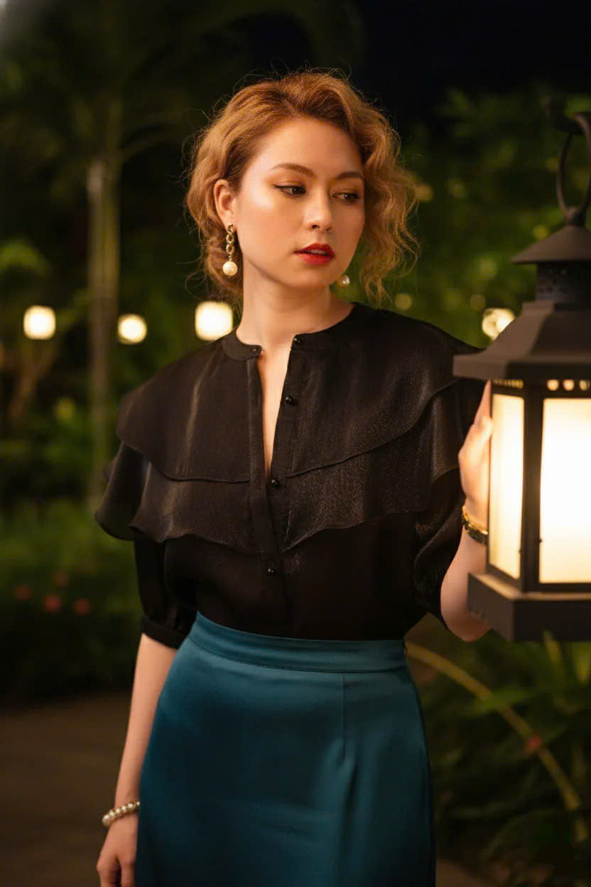 Những nếp nhún ly tầng ruffle mềm ở tay áo đung đưa theo từng hơi gió, như thể chúng biết rõ nhịp điệu của đêm nhiệt đới hơn chính ta. Khi kết hợp cùng chân váy lụa và vài món trang sức ngọc trai, ta không cần phải cố gắng nổi bật. Ánh đèn tự tìm đến, còn ta chỉ cần đứng đó, bình tâm và rực rỡ theo cách của chính mình.