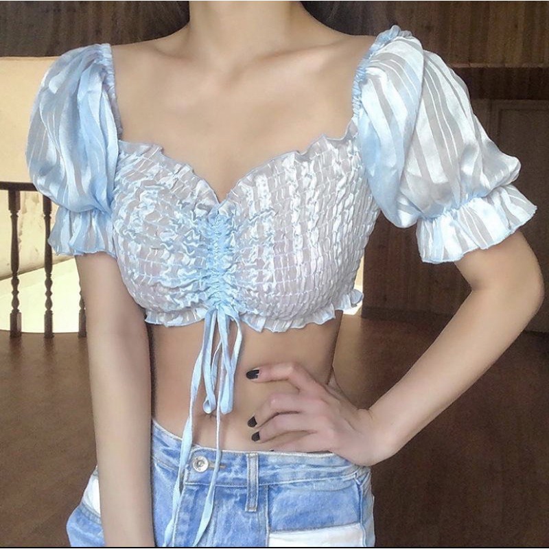 Áo Crop Xanh Nước Biển Tay Phồng Lưới, [ADORABLE], Croptop Nhúng Ngực Xanh Biển Ulzzang Hot Trend 2021 Ảnh Thật