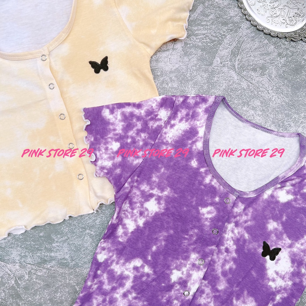 Thời Trang Nữ > Áo > Áo thun || Áo Croptop Body Cổ Tròn Tay Ngắn Cúc Bấm Loang Màu Thêu Bướm A5086