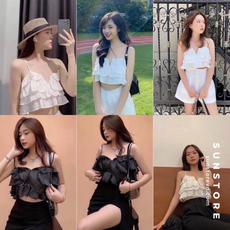 Áo croptop kiểu hai dây phần thân xếp bèo dây điều chỉnh 2 màu đen và trằn SAKURA TOP