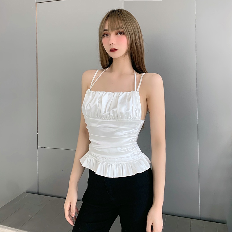 Thời Trang Nữ > Áo > Áo hai dây và ba lỗ || Áo croptop trắng đan dây lưng dún bèo HAC124 Hỉn Hỉn Store