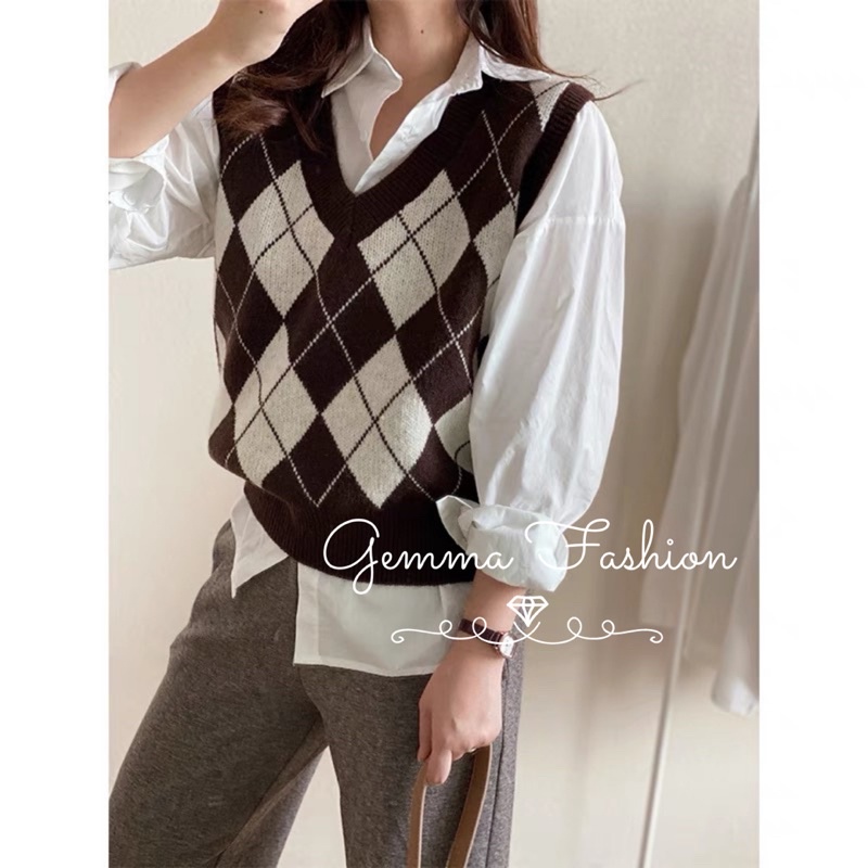 Giới thiệu Áo gile Len hoạ tiết kẻ ca ro, kiểu dáng Hàn Quốc (2 màu đen, nâu đỏ) A044