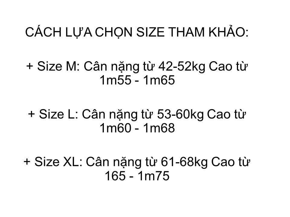 Bảng kích thước mang tính chất tham khảo, để lựa chọn đúng kích thước chuẩn của mình, anh/chị vui lòng chat với CSKH, các bạn sẽ giúp mình chọn đúng size nhé!