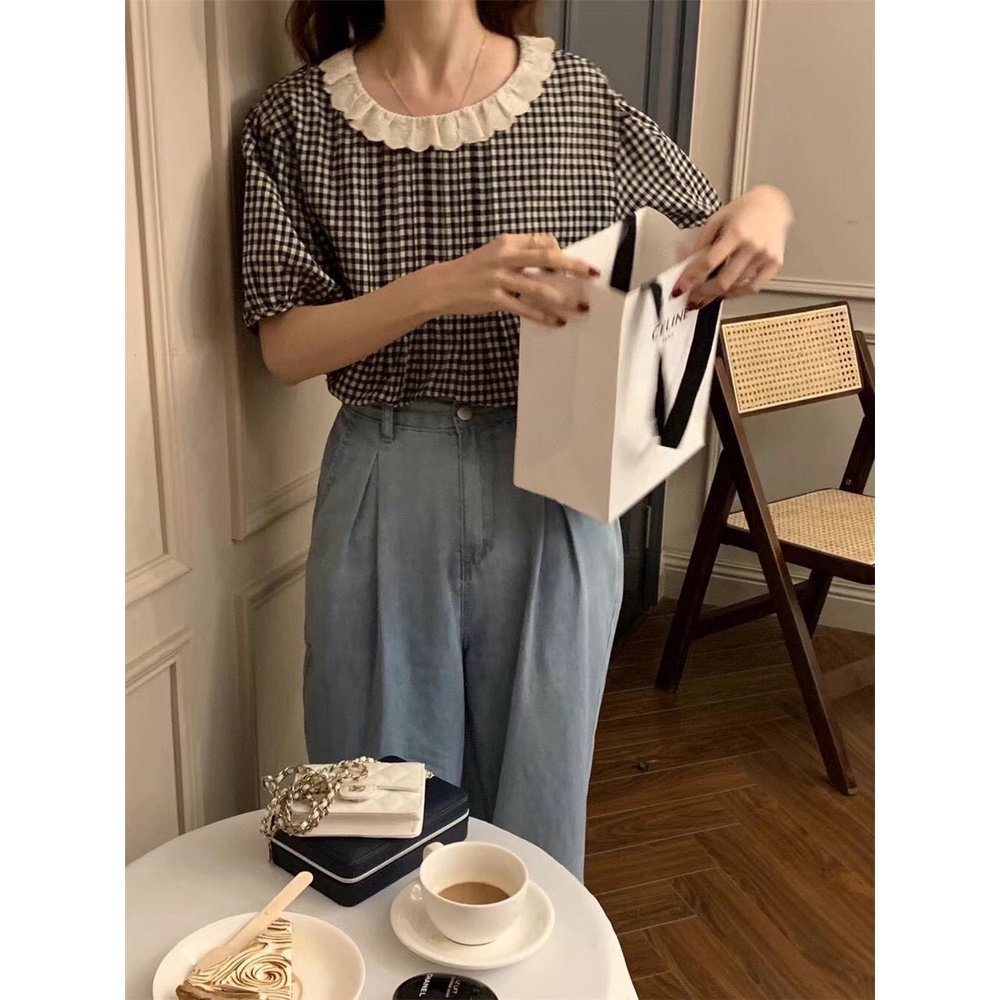 Thời Trang Nữ > Áo > Khác || Áo kẻ phối cổ ren bèo phong cách hàn quốc