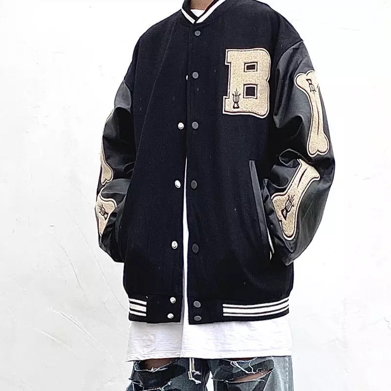 Giới thiệu ÁO KHOÁC BOMBER PHỐI TAY DA NAM NỮ T-A-N FORM RỘNG VAI SỆ-AKD5-Vải Dạ phối Tay Da cực ngầu hình thêu màu đen