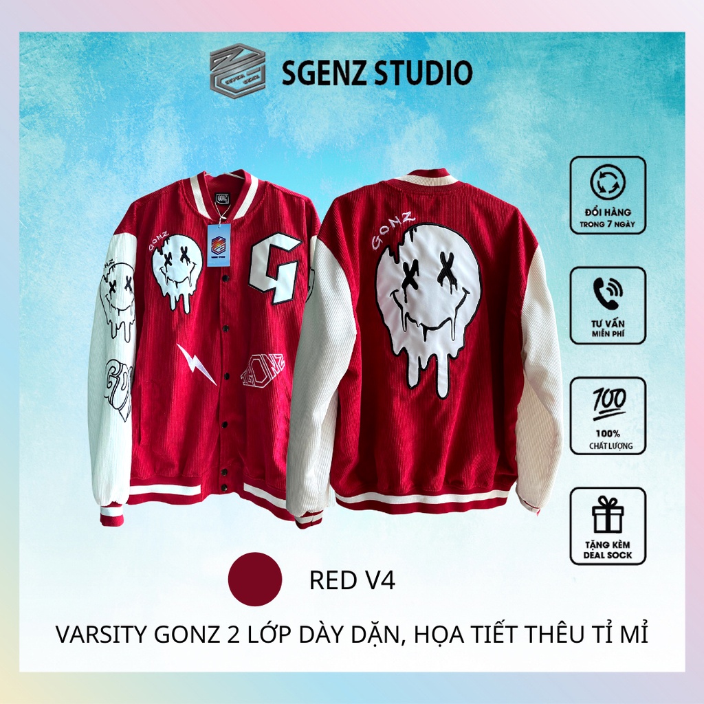 Giới thiệu Áo khoác bomber, varsity jacket Gonz Red full face nam nữ Form rộng,nhung tăm,áo khoác bóng chày gonz