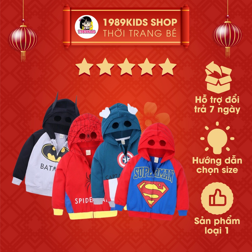 Áo Cho Bé Từ 1 Đến 8 Tuổi Chất Cotton Mềm Mại ------------- 🏅️🏅 Với phương châm “BÁN HÀNG LÀ PHỤC VỤ” 1989KIDS luôn luôn cố gắng mang đến những trải nghiệm sản phẩm chân thực nhất đến với quý khách hàng,cam kết sản phẩm chất lượng, hỗ trợ đổi trả nhanh chóng ------------- 🍀 Áo Khoác Cho Bé Trai Bé Gái được làm từ : - Chất liệu : Bông Cotton 100% - Độ tuổi áp dụng : Từ 1 đến 8 tuổi - Giới tính : Bé Trai,Bé Gái - Hình : Người nhện , Captian , Siêu Anh Hùng , Batman - Độ dày : Bình Thường - Hình in sắc nét không bị bong dão khi giặt - Phù hợp mặc ở nhà và đi chơi cho bé - Co giãn siêu tốt giúp bé cảm thấy thoải mái khi mặc - Áo có mũ trùm đầu ------------- 🍀 Chọn size theo chiều cao hoặc cân nặng cho bé Size 90 cho bé - Cao 80->90cm - Nặng 10->12kg Tuổi 1->2tuổi Size 100 cho bé - Cao 90->100cm - Nặng 13->15kg Tuổi 2->3tuổi Size 110 cho bé - Cao 100->110cm - Nặng 16->18kg Tuổi 3->4 tuổi Size 120 cho bé - Cao 110->120cm - Nặng 19->22kg Tuổi 5->6 tuổi Size 130 cho bé - Cao 120->130cm - Nặng 23->25kg Tuổi 7->8 tuổi CÁC MẸ CÒN PHÂN VÂN THÌ HÃY INBOX CHO SHOP NHÉ ------------- 🍀 Cam kết và chế độ bảo hành : - 1989KIDS SHOP cam kết bán hàng chính hãng ,hàng nội địa các nước 100% . Tuyệt đối không bán hàng kém chất lượng , hàng giả - Hỗ trợ đổi trả 1 vs 1 khi phát hiện hàng bị hỏng , hàng lỗi - Lưu ý hàng đổi trả còn nguyên tem mác , bao bì , chưa qua sử dụng và giặt tẩy Thắc mắc xin liên hệ: ☎ 0343962018 #aokhoacchobe #aokhoacbetrai #aokhoacbegai #aochobe #aobegai #aobetrai