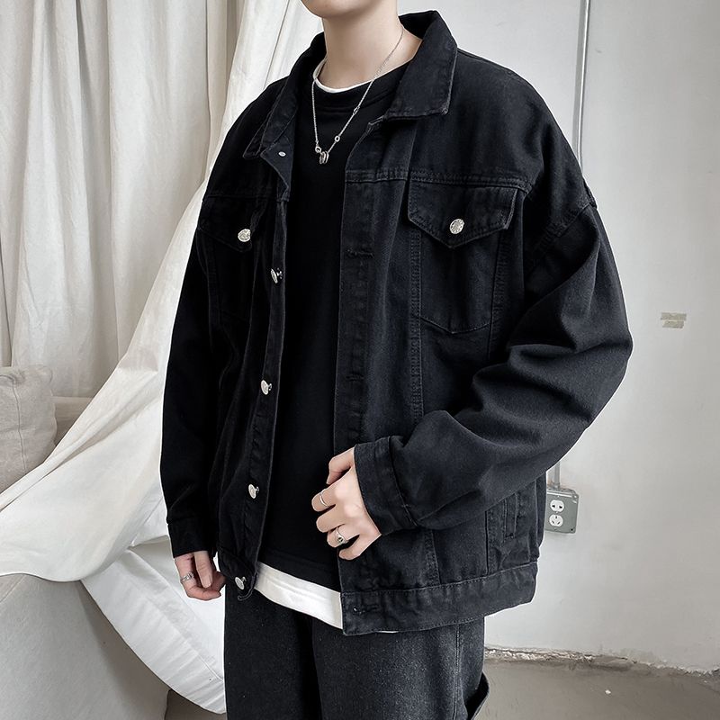 Giới thiệu Áo khoác jean nam màu đen có túi trước ngực cài cúc chất denim dáng suông thời trang thu đông