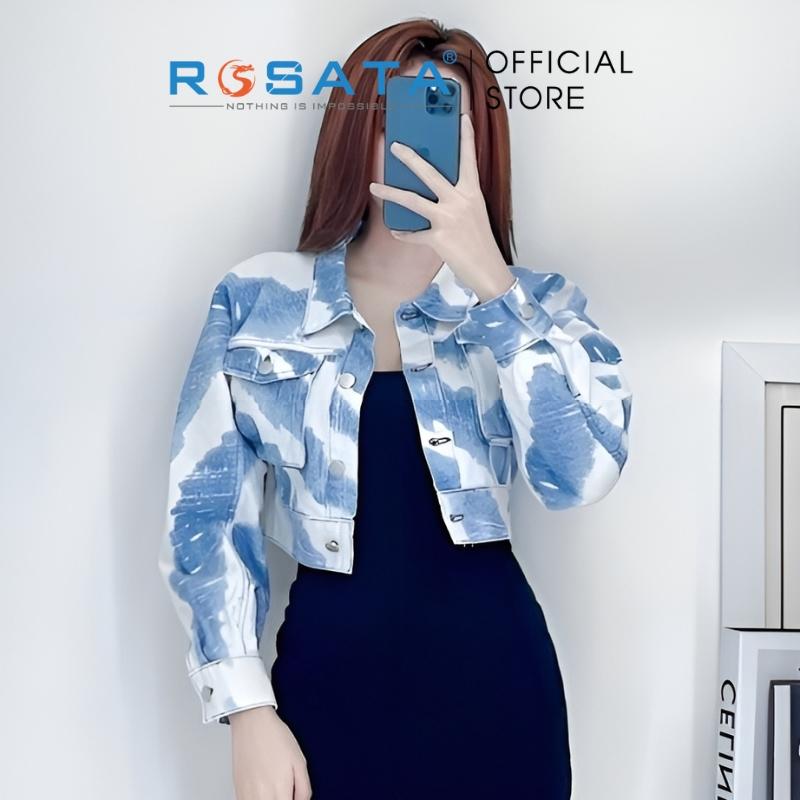 Tên sản phẩm: Áo khoác nữ ROSATA K22 tay dài 2 túi hộp nắp vuông form croptop jean loang mây xuất xứ Việt Nam