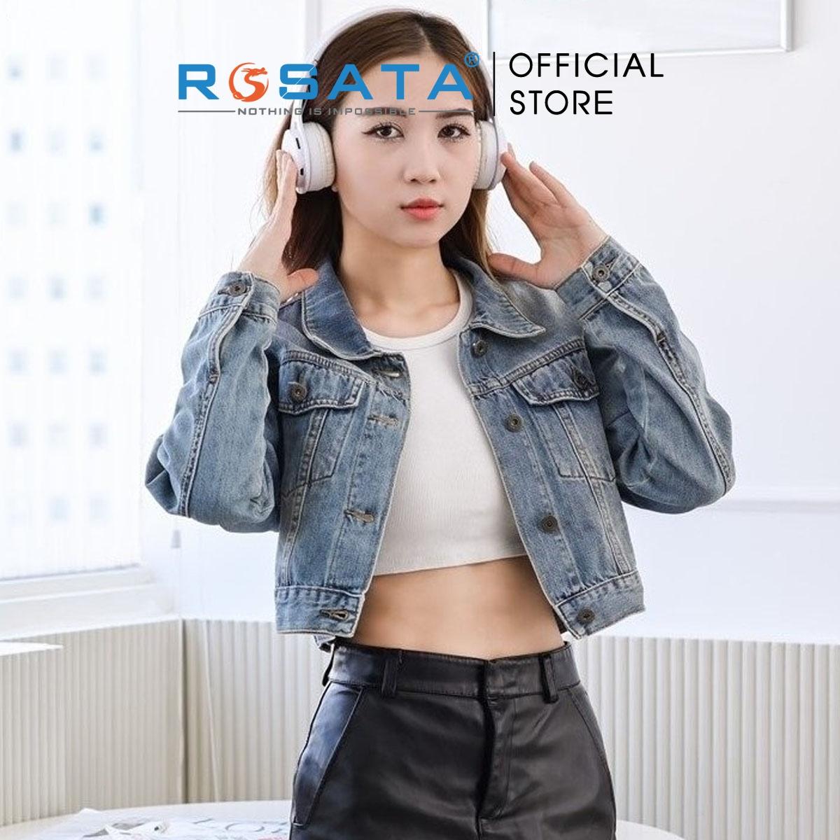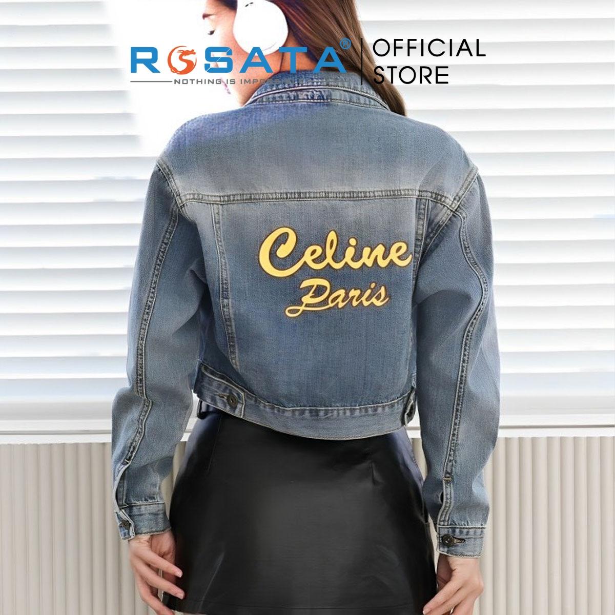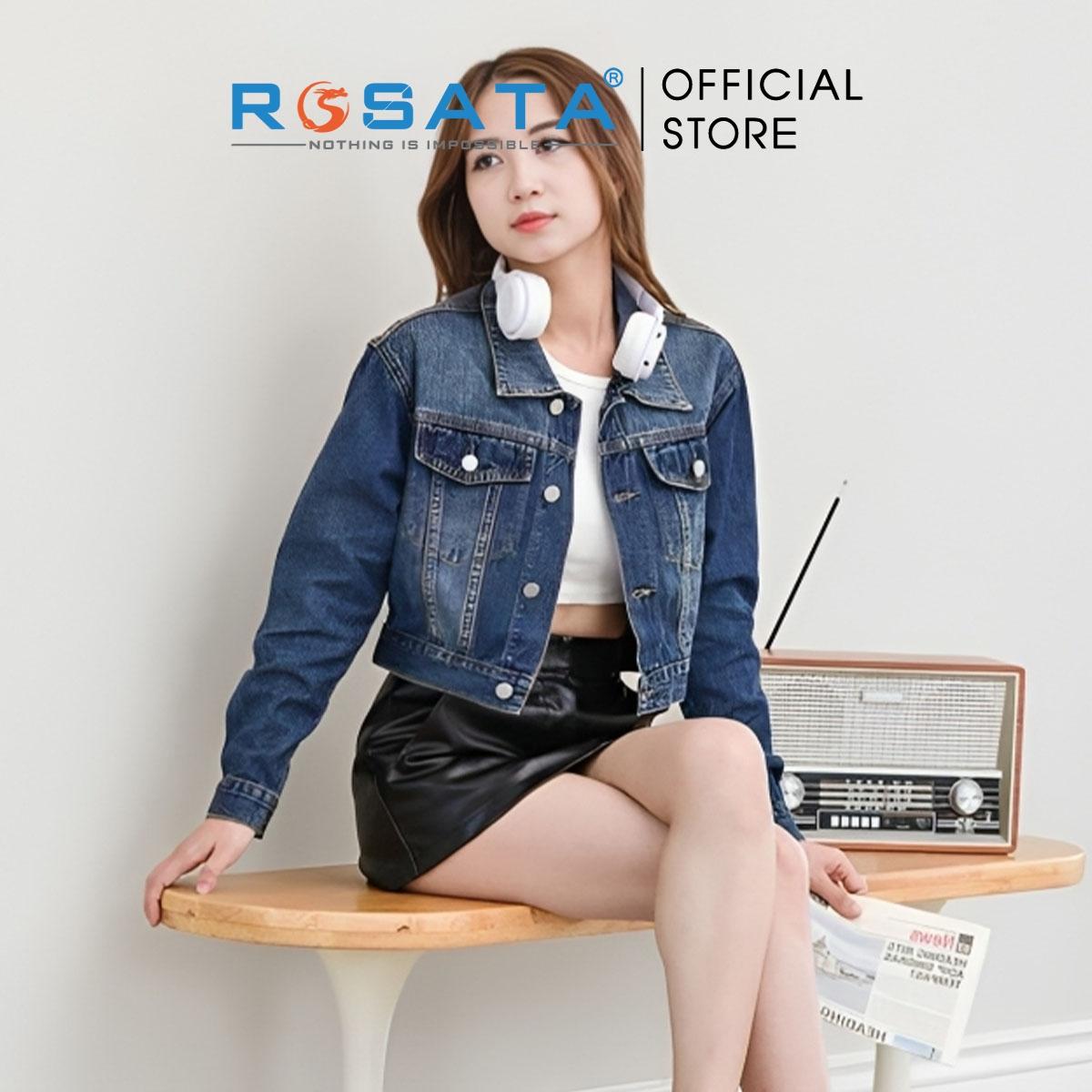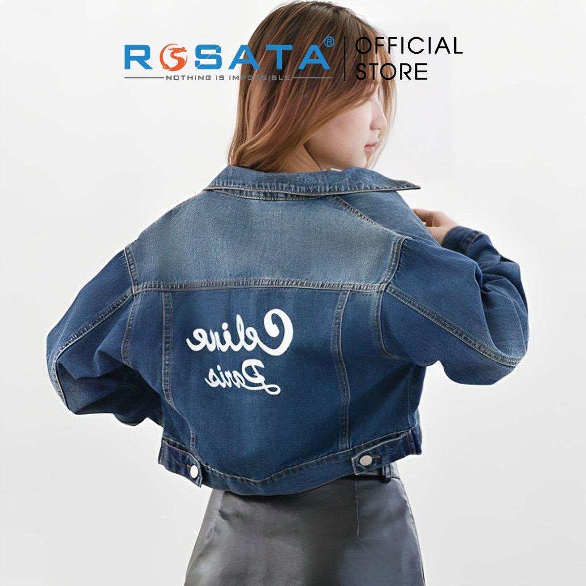Tên sản phẩm: Áo khoác nữ ROSATA K32 croptop jeans túi hộp cài cúc cao cấp in chữ mặt sau tay dài thoáng khí xuất xứ Việt Nam